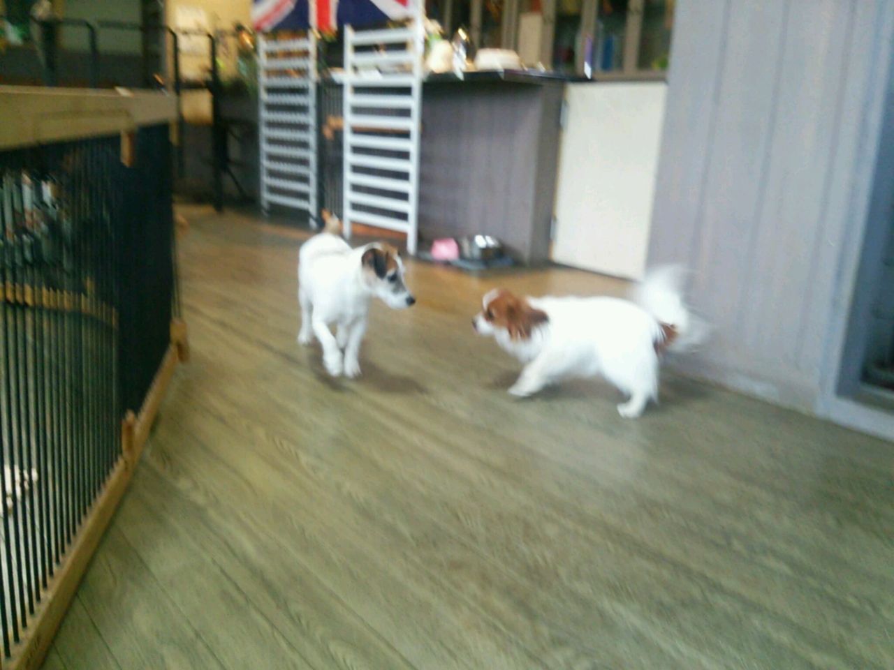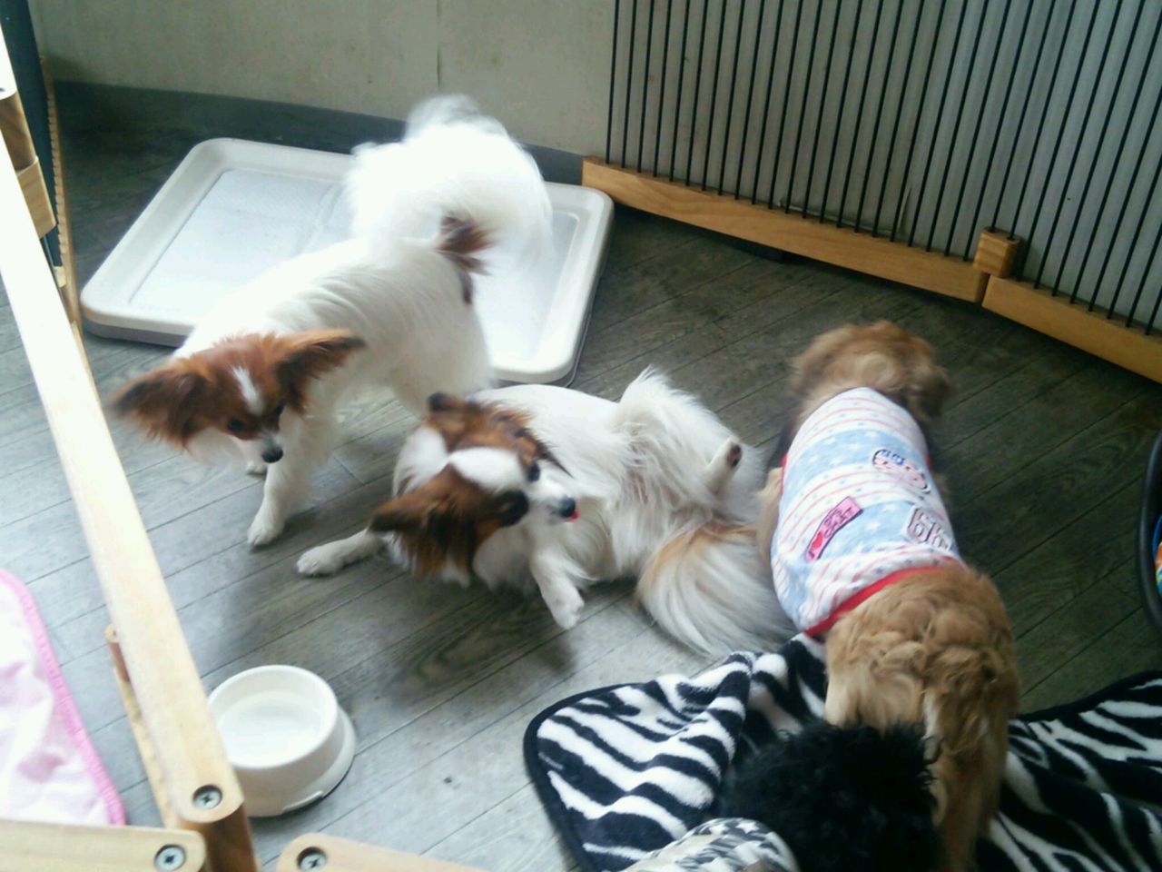 パピヨンちゃんがしきりに遊びかけてます。 でも風助君は先ずは匂いチェックに忙しいみたいです。