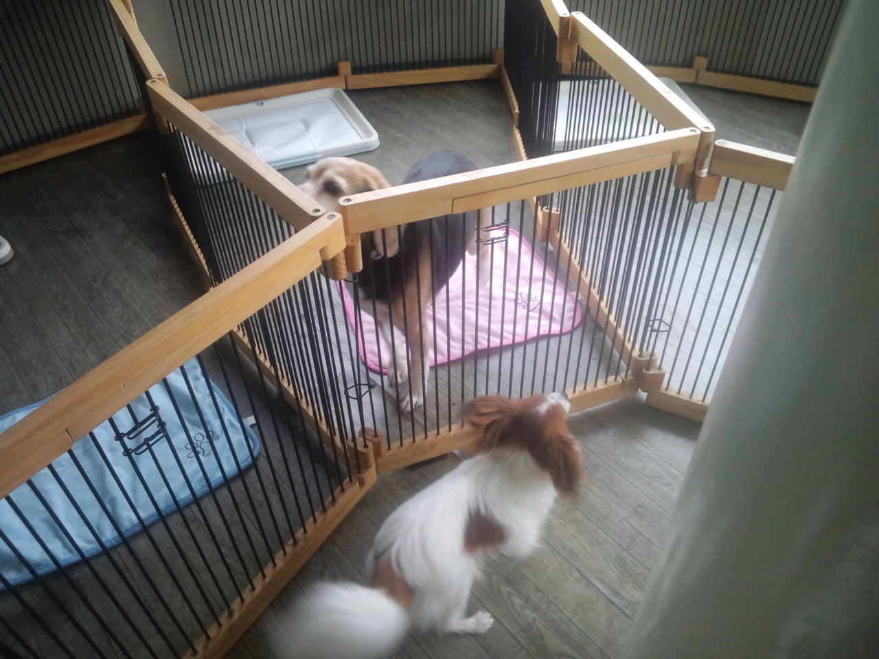 他のわんちゃんが?という感じでしたが、サークル越しでも尻尾振り振りだったのですぐにサークルから出ました。 マックスくんは他のわんちゃんと遊びたい~という感じで、モネちゃんは少し緊張気味かな?