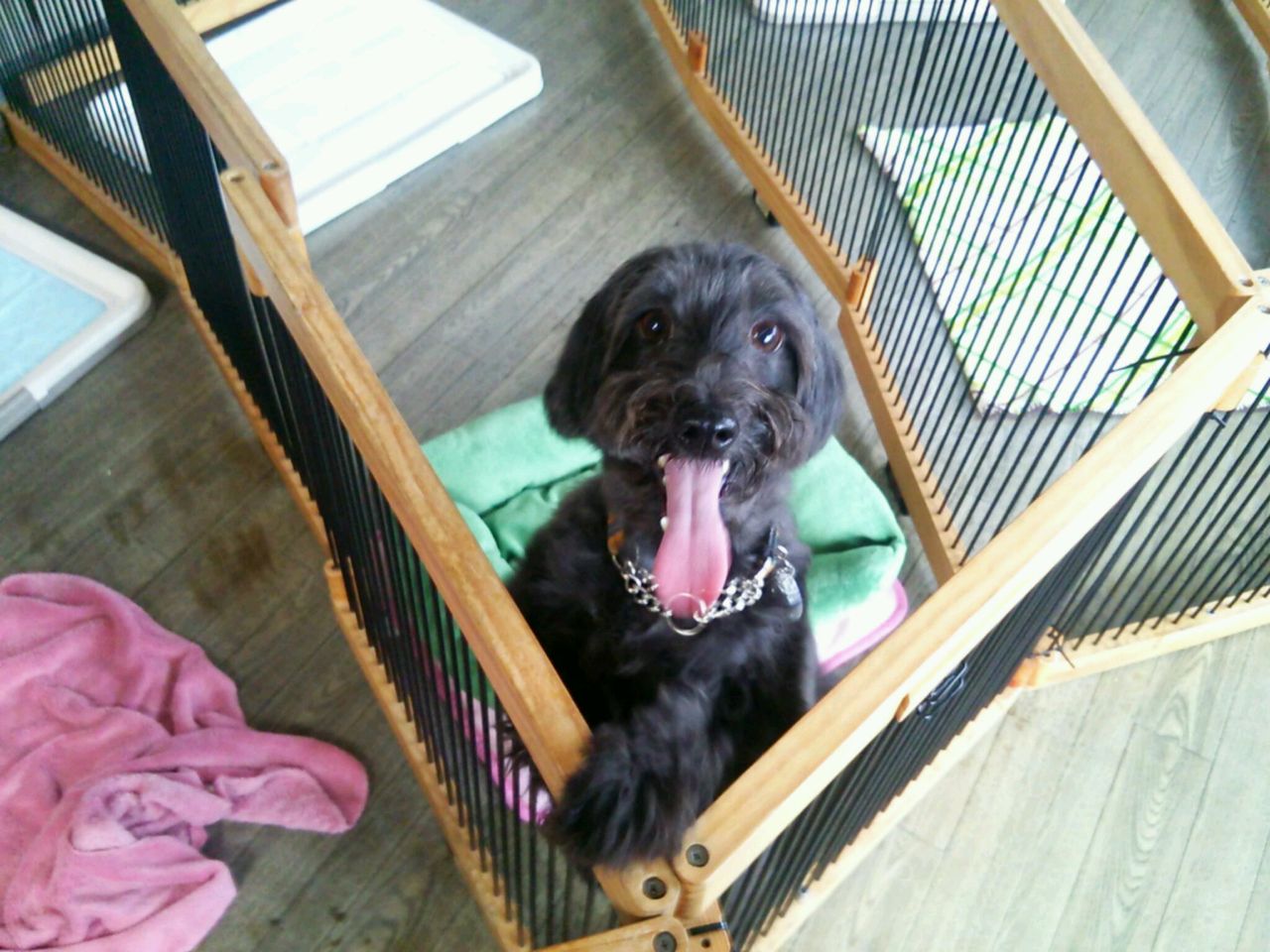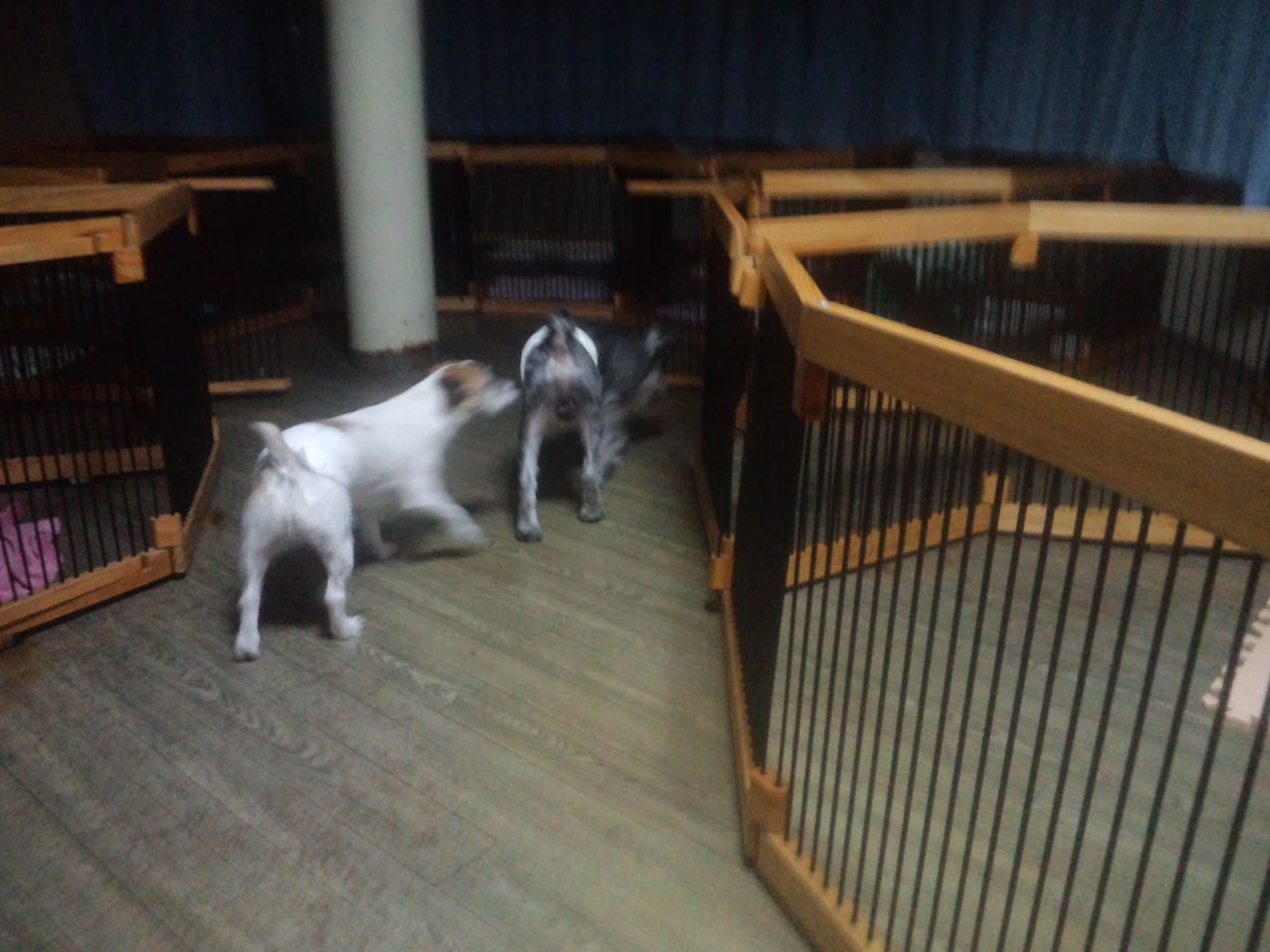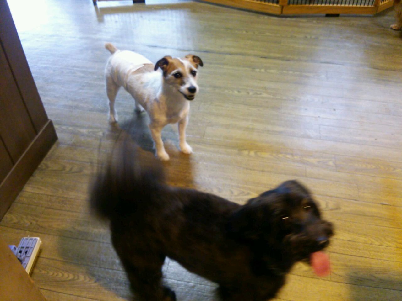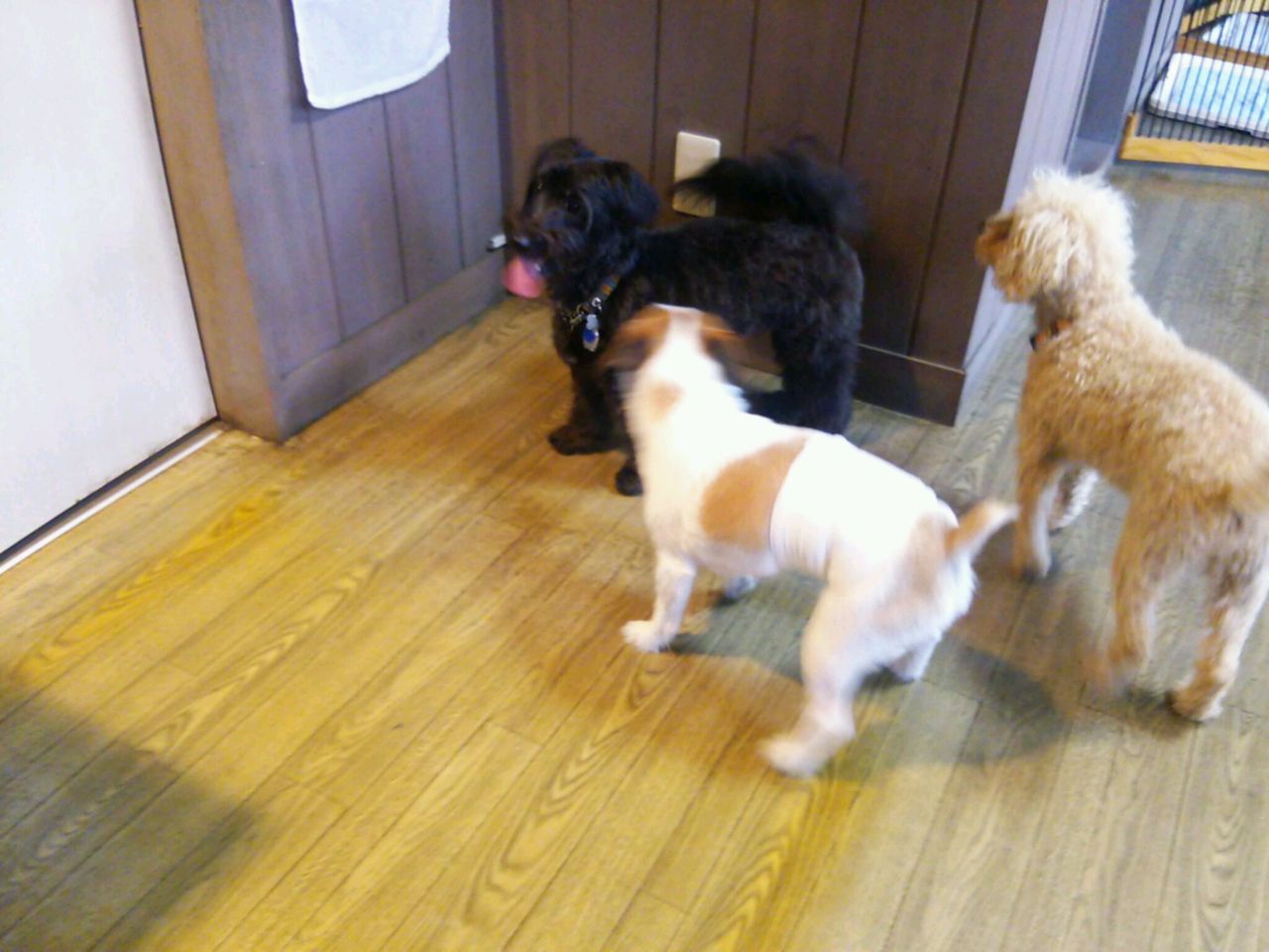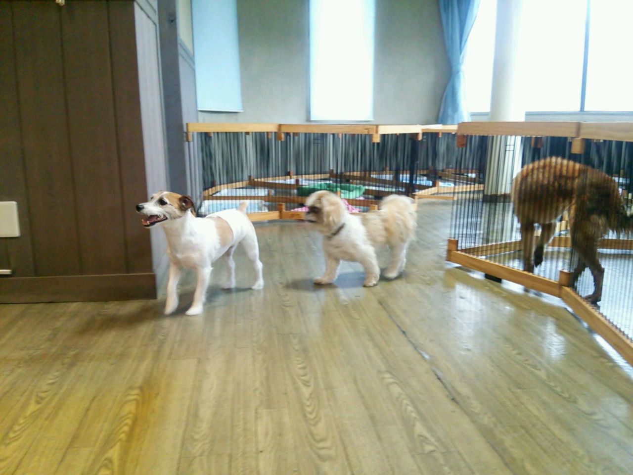 出たい出たいしたのですぐにサークルから出ました。 すぐにみんなと仲良しになってます♪ 特にジャックラッセルリキくんとは一番の仲良しです。