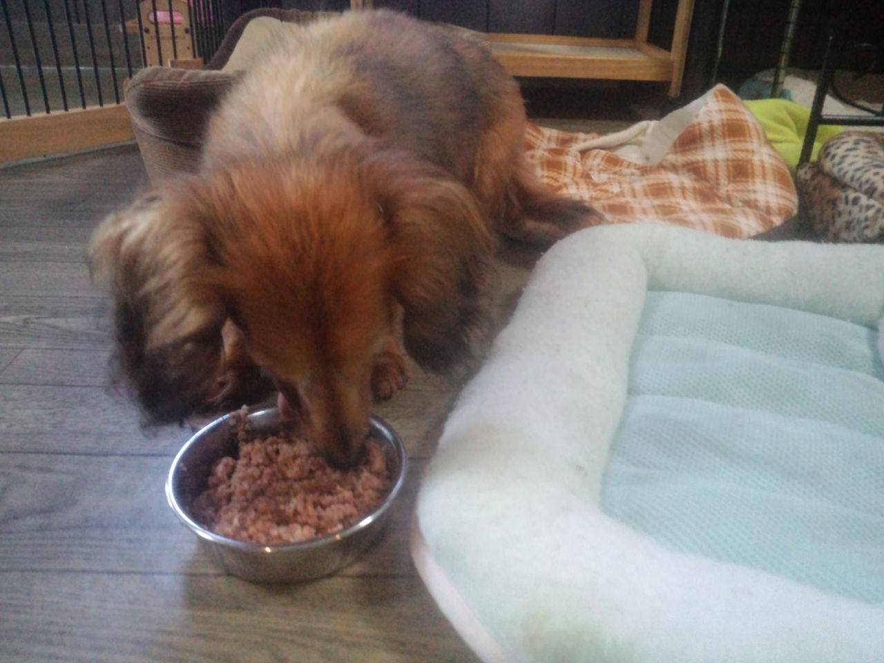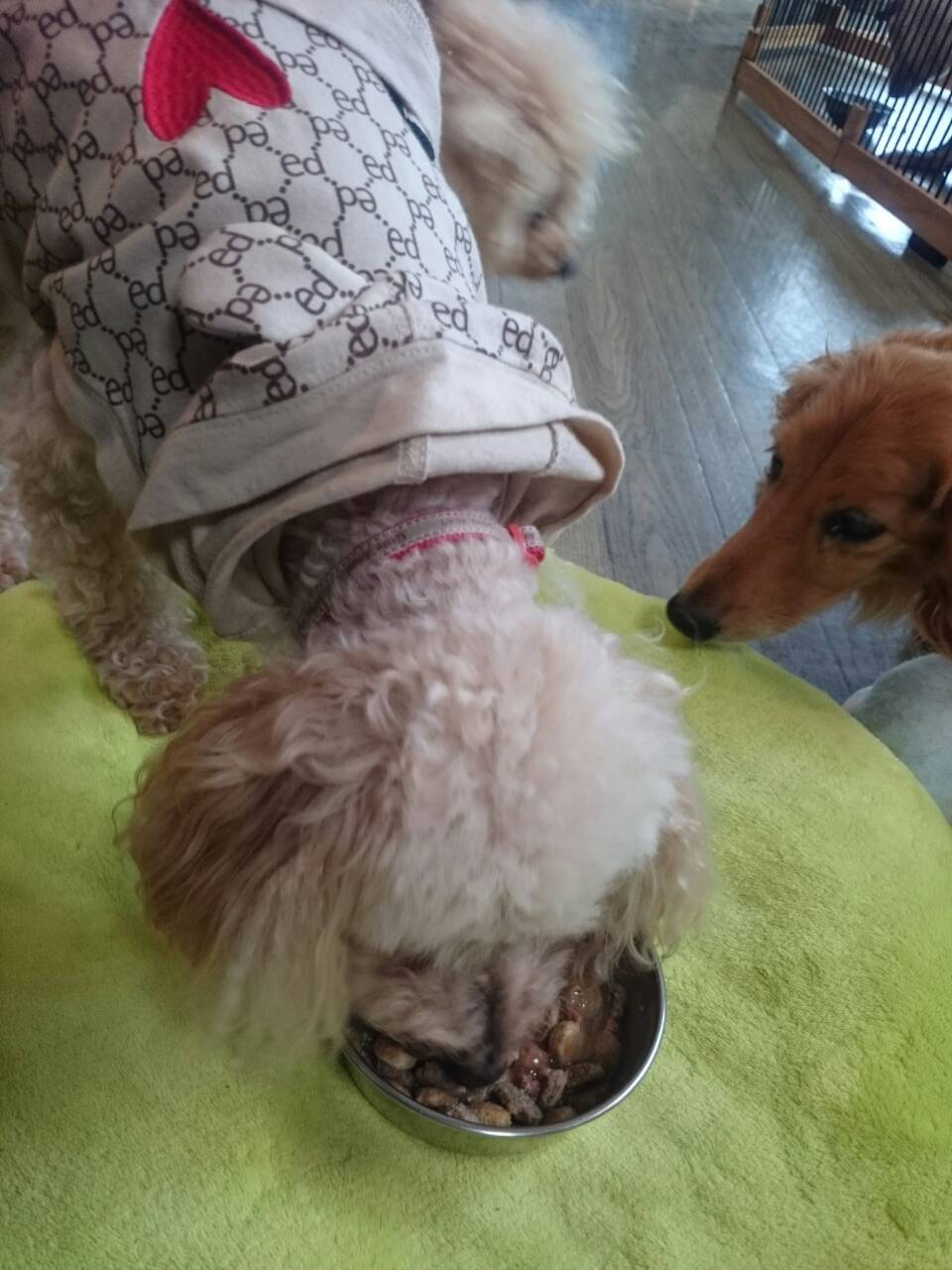 生涯預かりダックスズのラブ君、口をつけません。チャコ君、しっかり完食しました。