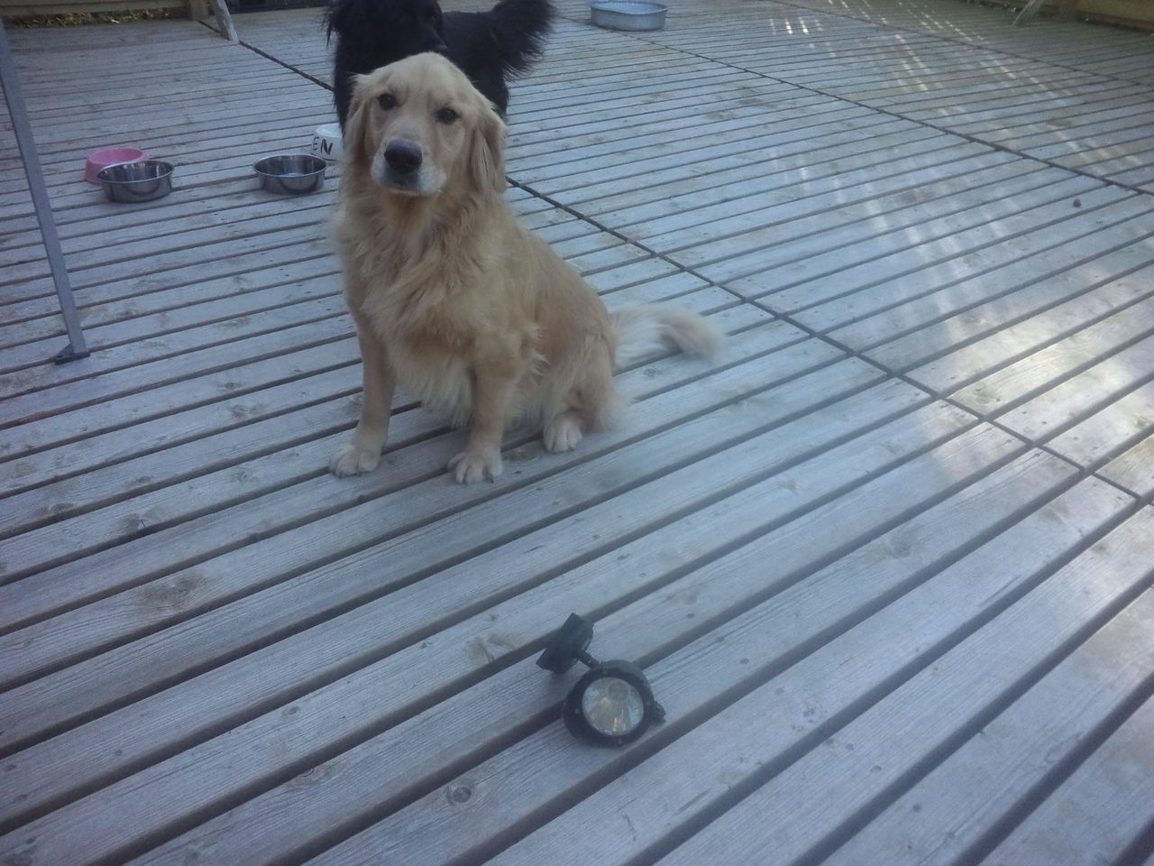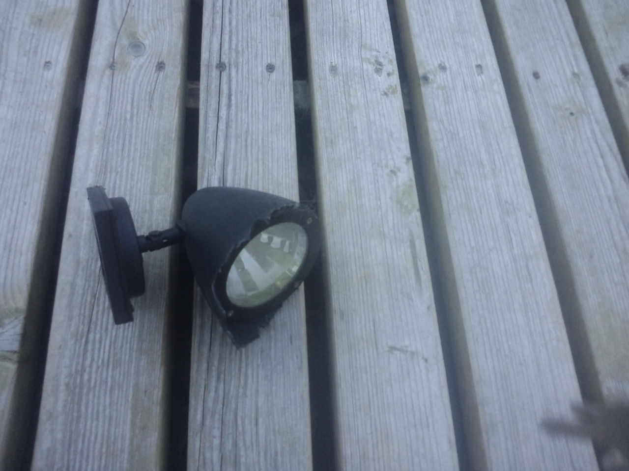 朝になって大型犬エリアに入ってみると、無残な姿でデッキに転がっているソーラーライト。