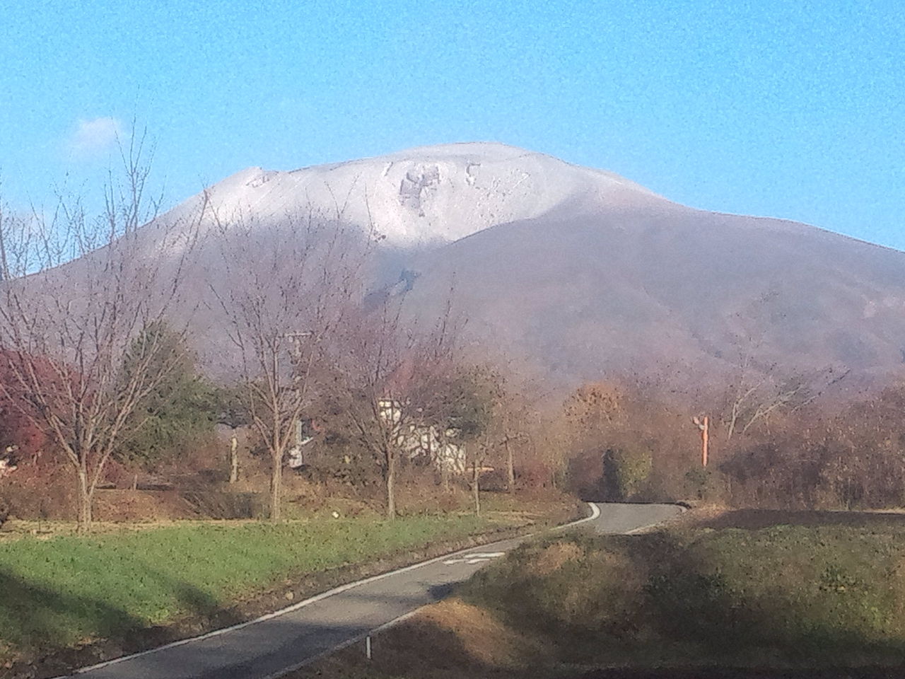 浅間山のてっぺんが少し雪を被った様子です。