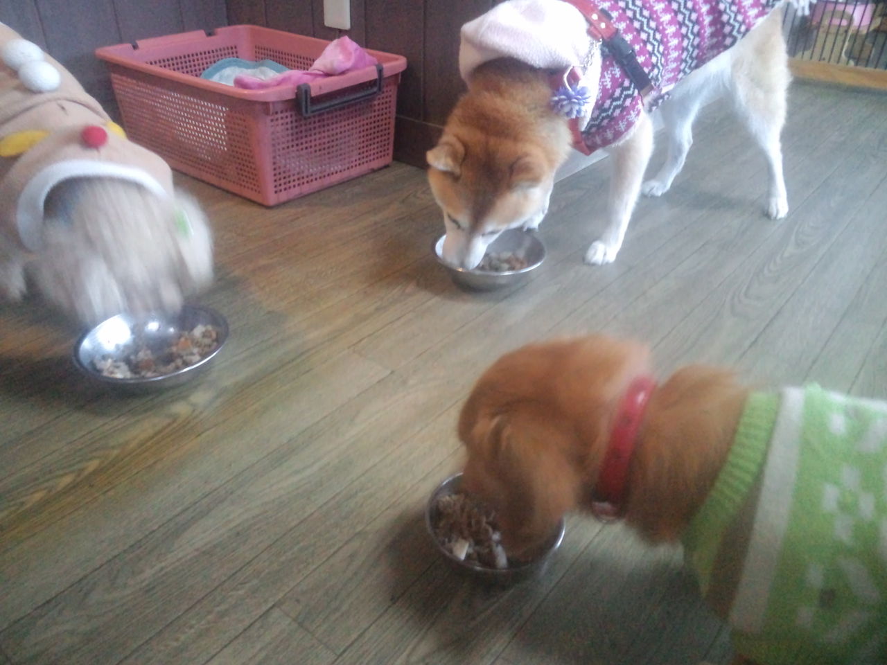 長期預かりゴールデンジョジョ君と小太郎君、しっかり完食しました。柴ジロー君、ジャーキーだけ選んで食べました。