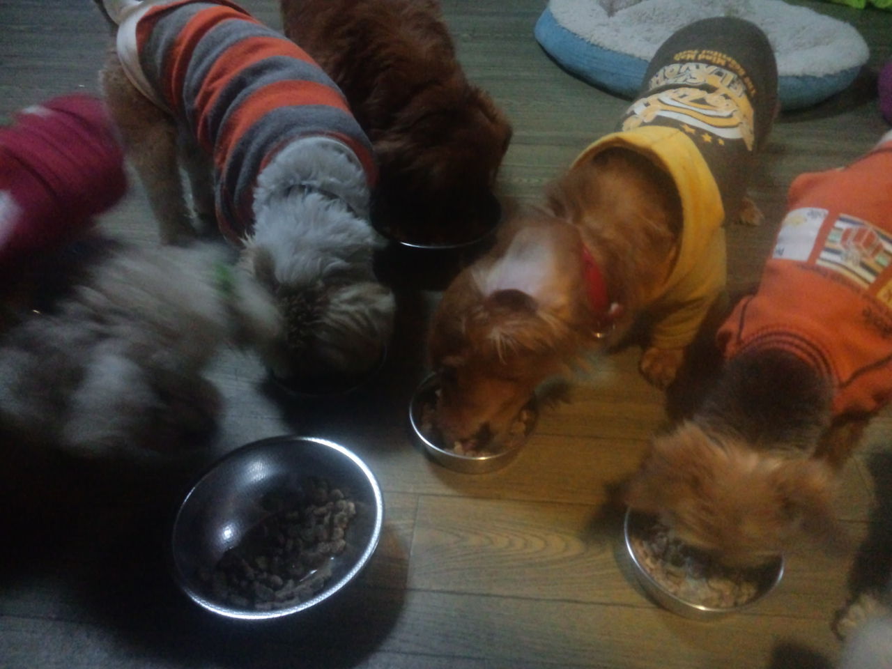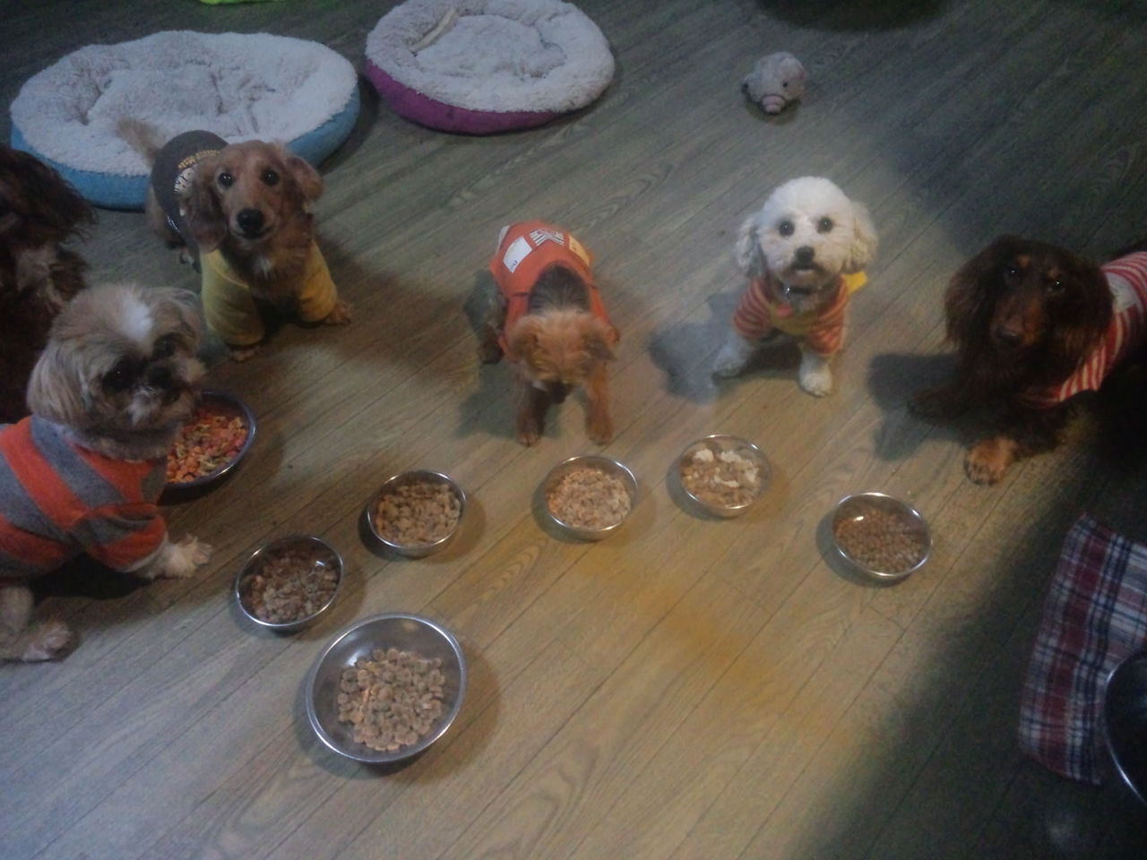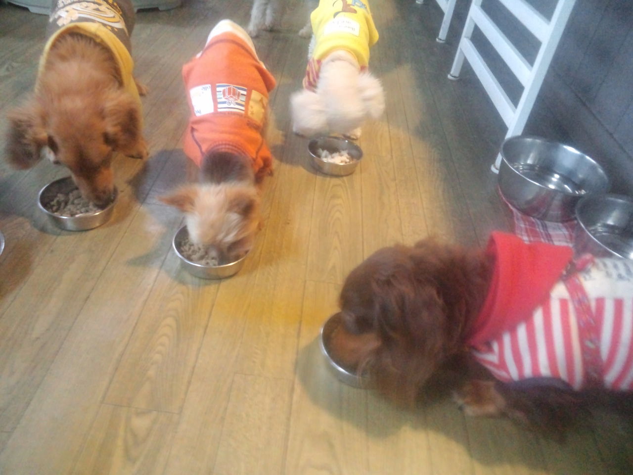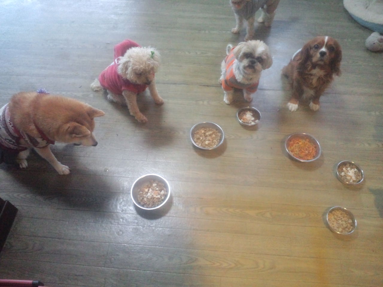 生涯預かりダックスズのラブ君、口をつけません。チャコ君、ヨーキーアイちゃんとシーズーココ君、しっかり完食しました。