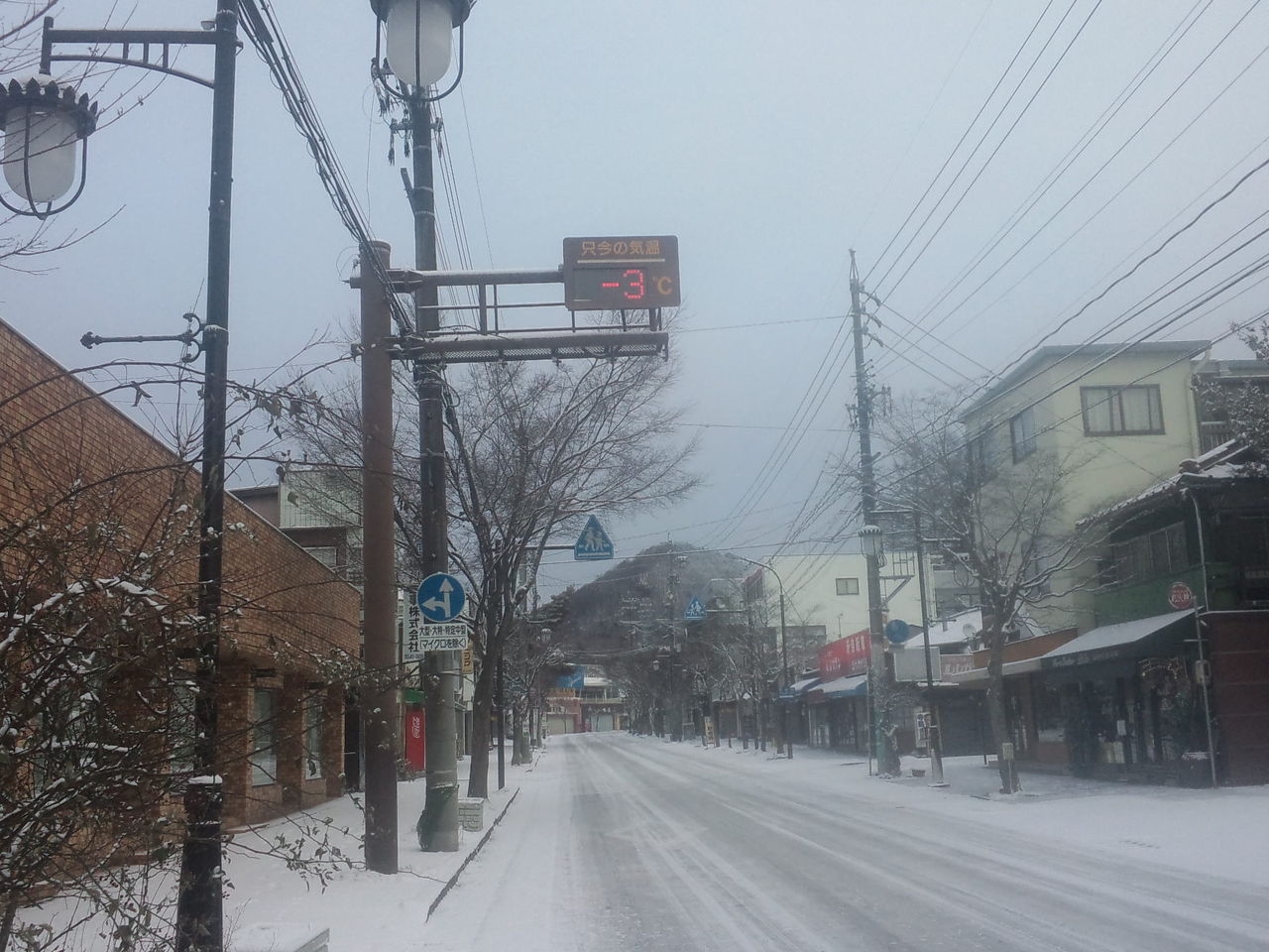今朝の軽井沢の気温はマイナス3℃。天気は雪が降ってます。滑るのでご注意ください。