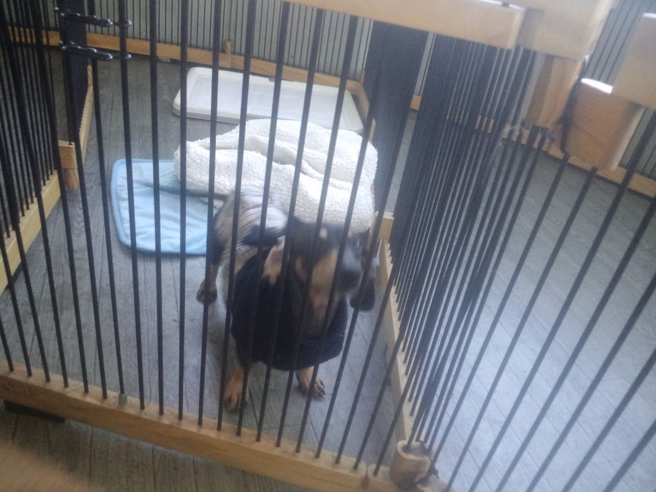 他のワンコ達ともご挨拶して仲良くしてます。その後は自分のサークルで寝てます。長旅で疲れたかな?