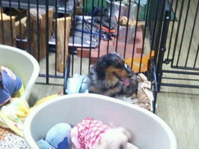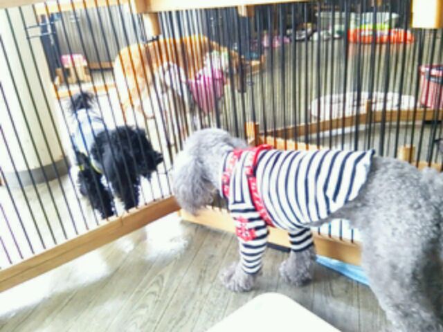 二日目だから慣れたかな? サークル越しにトイプー虎治郎と挨拶しています♪