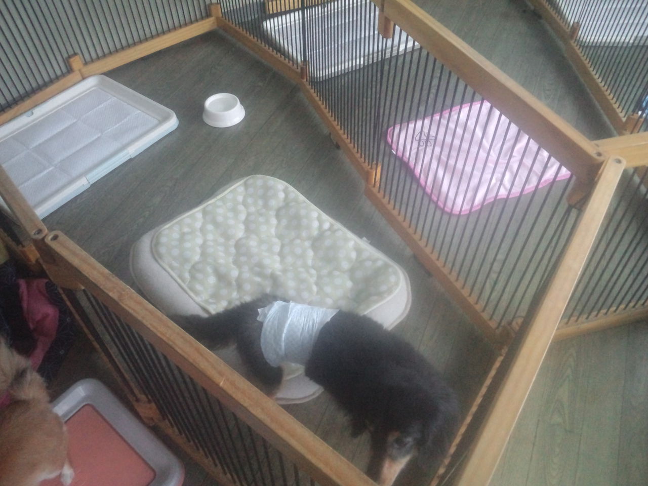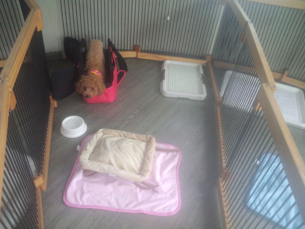サークルに入れたら、キャリーバッグからちょこんと顔を出すだけのサクラちゃん。まだ緊張してるかな?