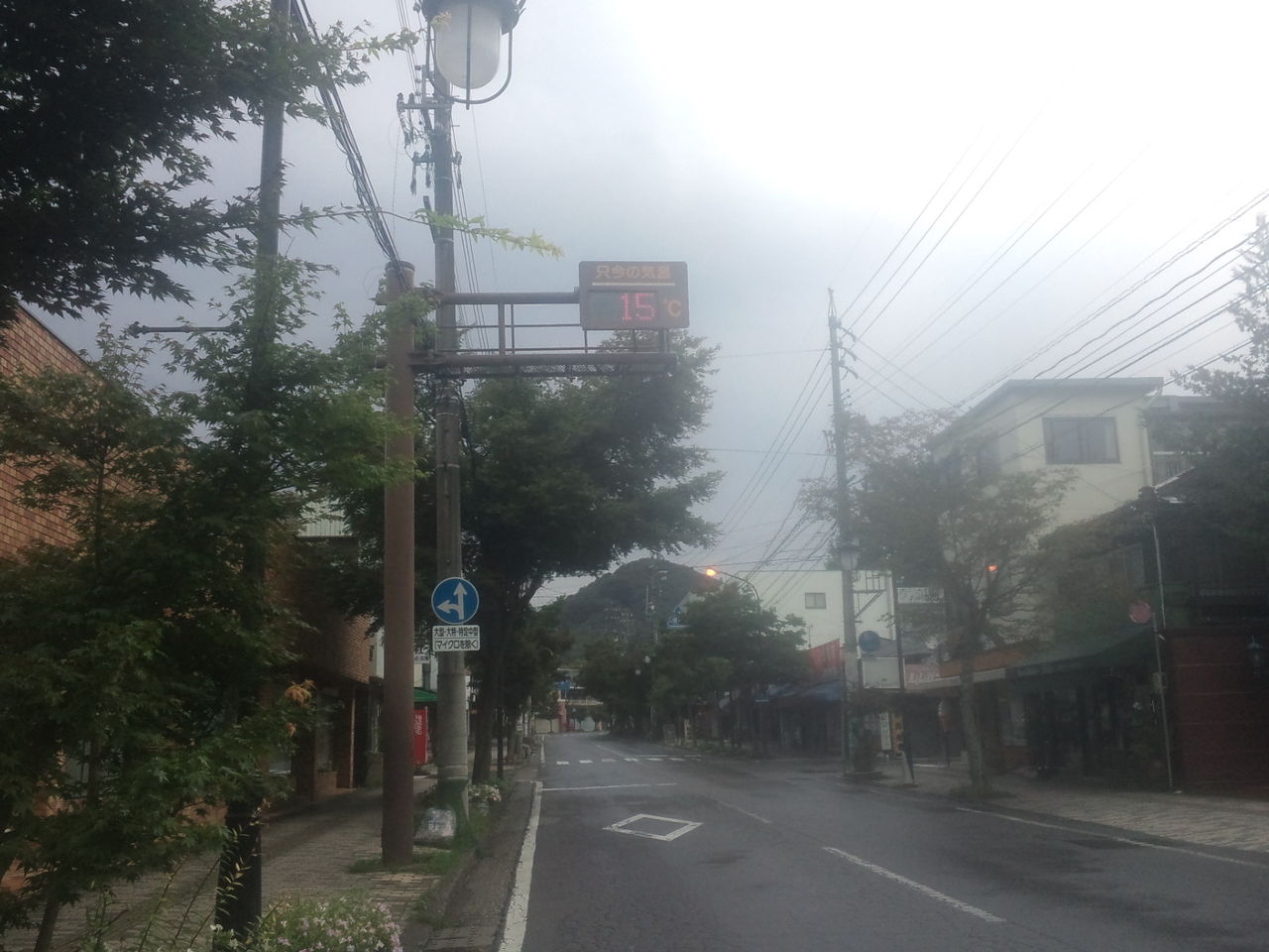 今朝の軽井沢の気温は15℃、天気は雨が降ったり止んだりです。