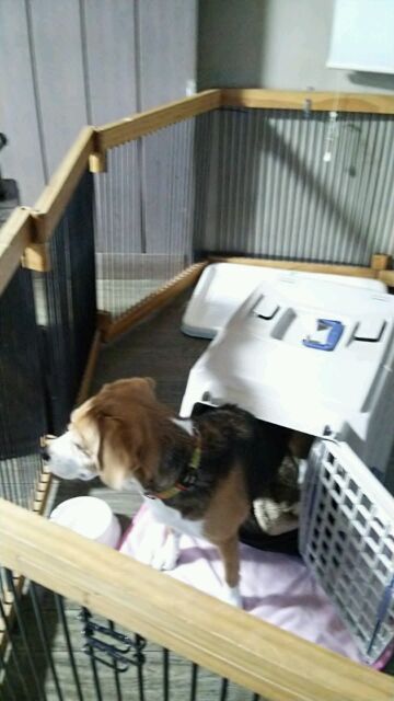 自分のケージから出て周りをキョロキョロしたり、遠吠えしてみたりほぼケージから出ています。