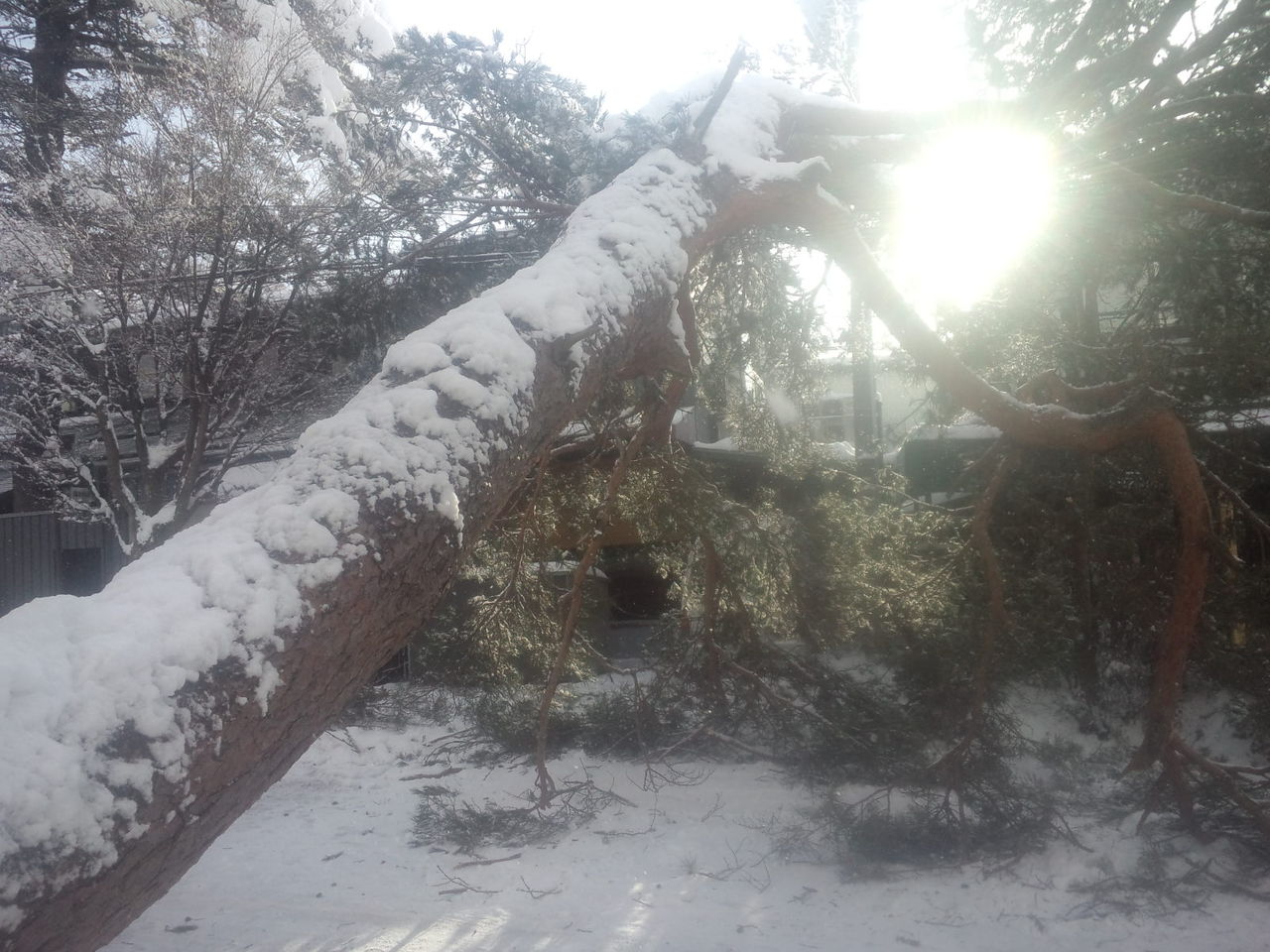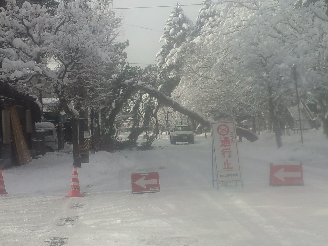 雪の重みでか離れ山線ロータリー付近で赤松が倒れてます。通行止めで迂回が必要です。