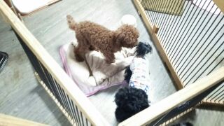 サークルにトイプー虎治郎を入れてみたら興味津々です。 ご飯は食べません。少しの間置いておきます。