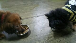 ダックスズミニーちゃん甘えていてご飯どころではありません。プリンちゃんは少し食べました。