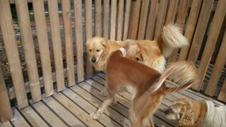 仲良しのゴールデン小太郎くんも一緒に中型犬エリアに入れてみたら匂いを嗅いでみたり、じゃれあったりしています。