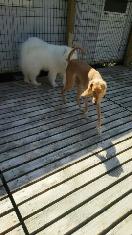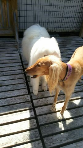 久しぶりに会うサモエドてんきゅうくんともすぐに仲良くなってお互いをクンクンしています。