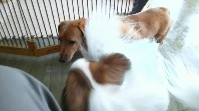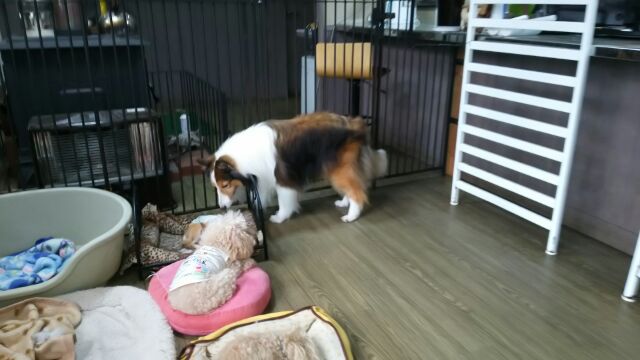 サークルから出たそうだったので扉を開けると出てきました。 他のわんちゃんには興味津々です。 寝ているわんちゃんの匂いを嗅いだりしています。