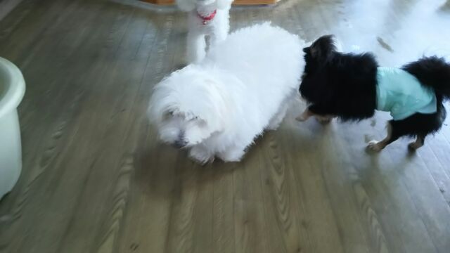 他のわんちゃんとは大丈夫かな?というお話でしたが、すぐにサークルから出ました。 セナくんはマイペースなようで好きに歩き回っています。 ルイくんは他のわんちゃんに興味があるようで匂いを嗅ぎに寄っていっています。 でも、人の方が好きなようで店長やスタッフに甘えています。