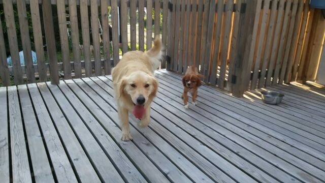 中型犬エリアでキャバリア大吉くんとすぐに仲良くなって一緒に走り回っています♪