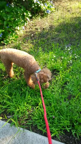 初めての場所で最初は緊張している感じでしたが、少し歩くと草や花の匂いをクンクン。 グイグイ引っ張ってたくさん歩いてきました♪