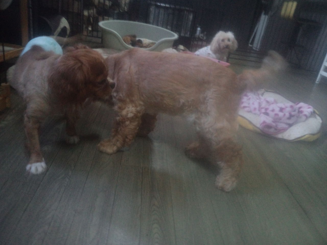 いつもいっしだったキャバリア大吉君を中型エリアから連れて来て、チャッピーちゃんもサークルから出して会わせたら二匹とも大喜びしてます。