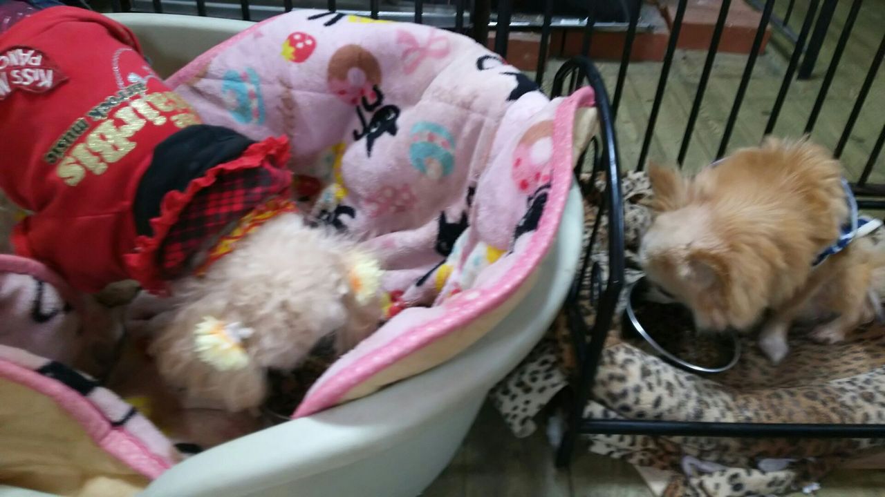 モカちゃんはすぐにキャリーバッグの中に入って休んでいます。 モモちゃんは出せ出せの大騒ぎだったのですぐに出しました。 自分から他のわんちゃんに寄っていったり、スタッフに寄ってきたりしています。