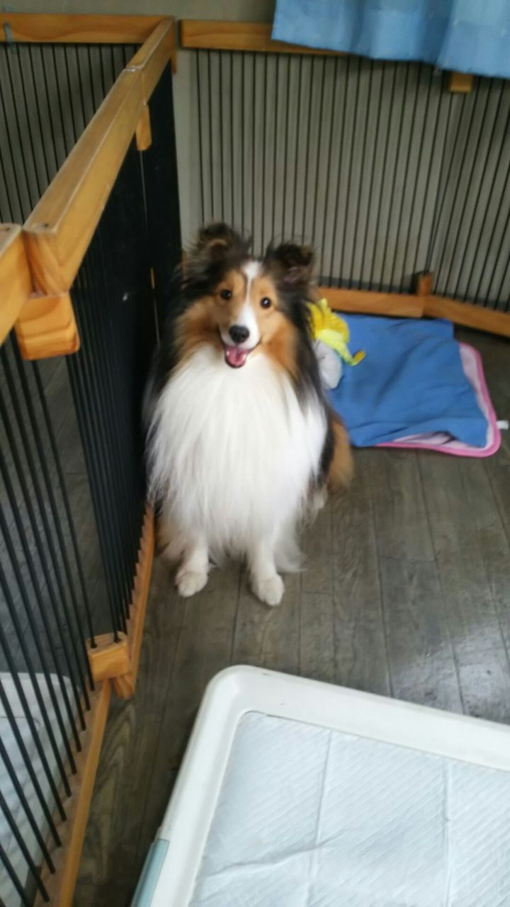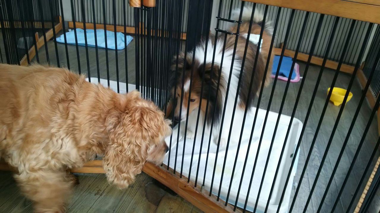 特に鳴いたりしていないのでそのままサークルに入っています。 サークル越しにコッカーチャッピーちゃんとご挨拶♪