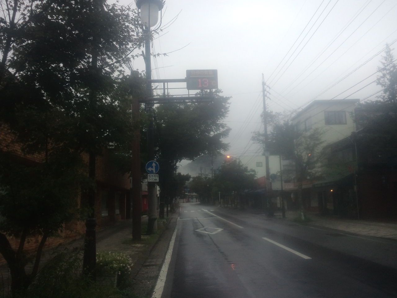 今朝の軽井沢の気温は13℃、天気は降ったり止んだりです。