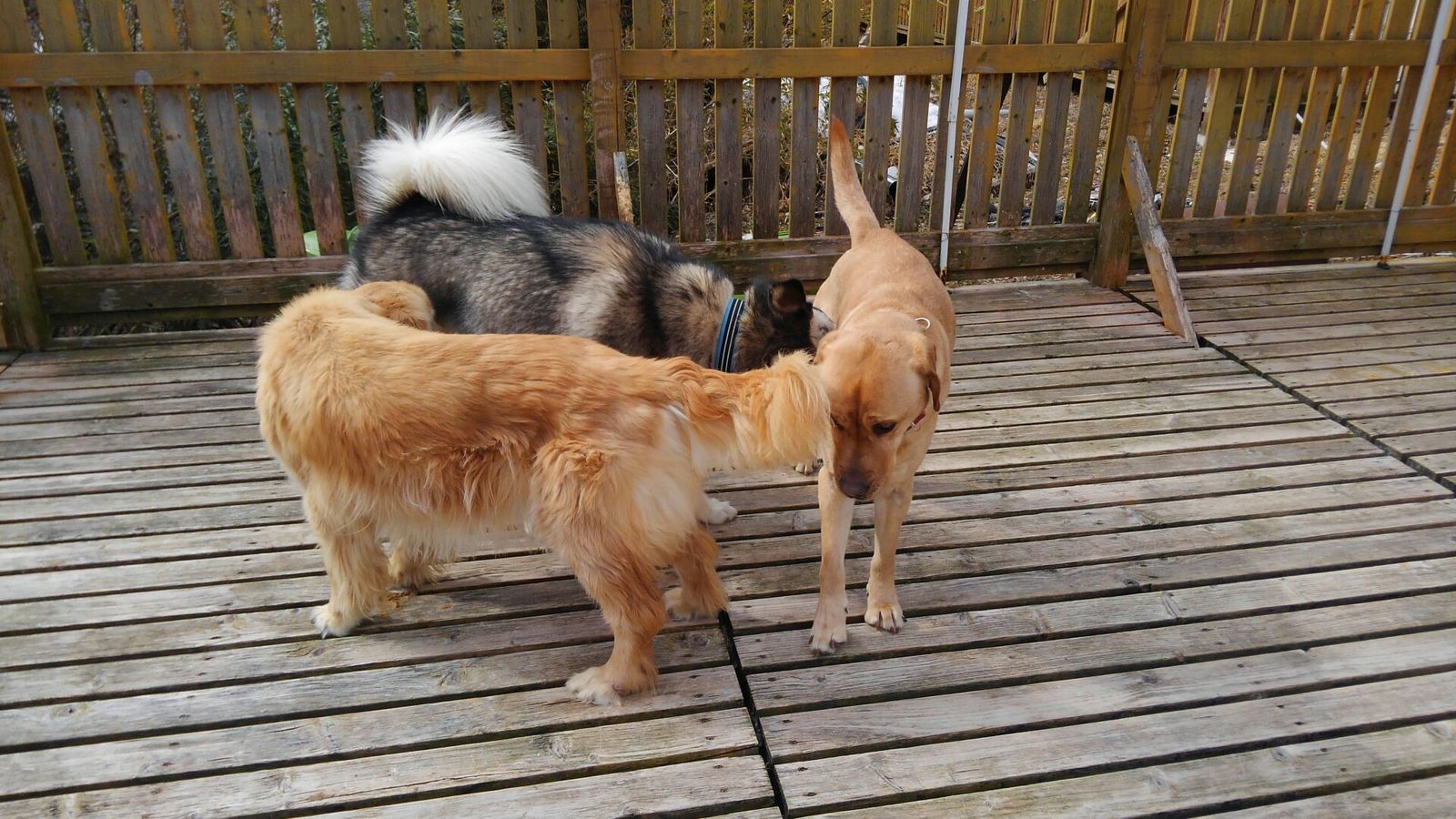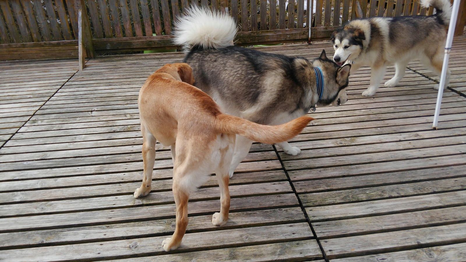 すぐに皆と遊び始めてます。初対面のラブラドールみかん君とも仲良く出来そうです。