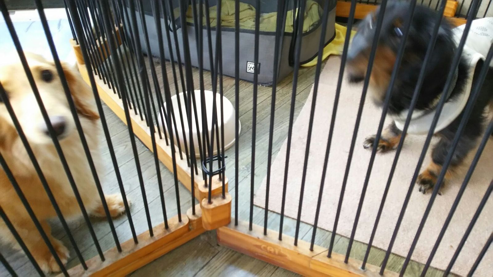 今日もスタッフに甘えています。 隣のサークルのダックスティラミスくんとも挨拶したりしています。