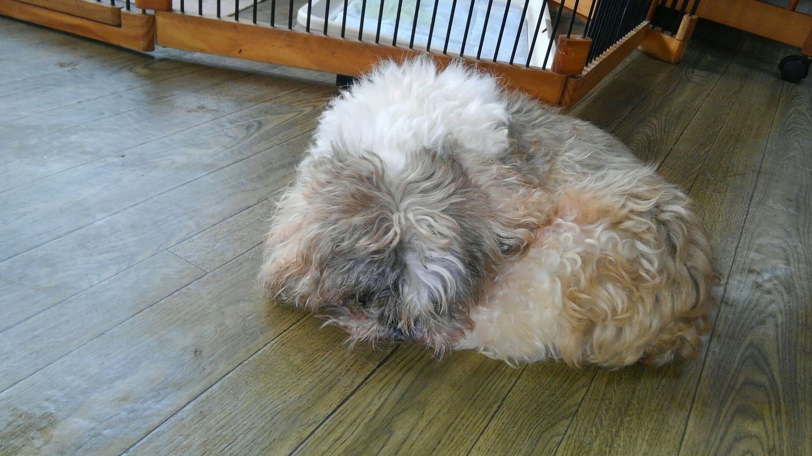 軽井沢でも今日は暑いです。 小型犬エリアでは思い思いに昼寝してます。 特にコーギーナナちゃん、凄い寝方してます。