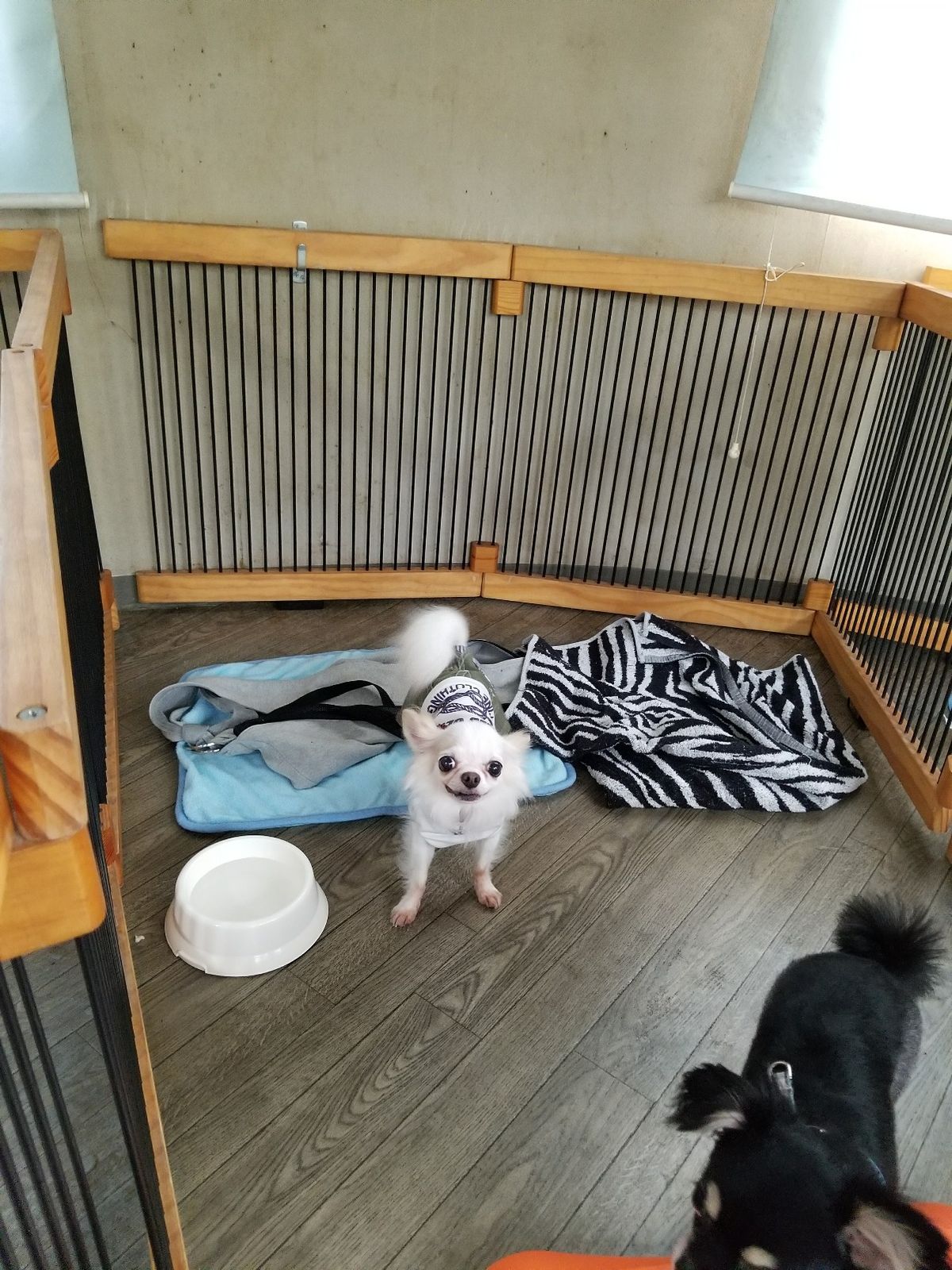 にじちゃんはサークルから出て他のわんちゃんと挨拶しています。 じゅうちゃんは出たがらないのでそのままサークルにいます。