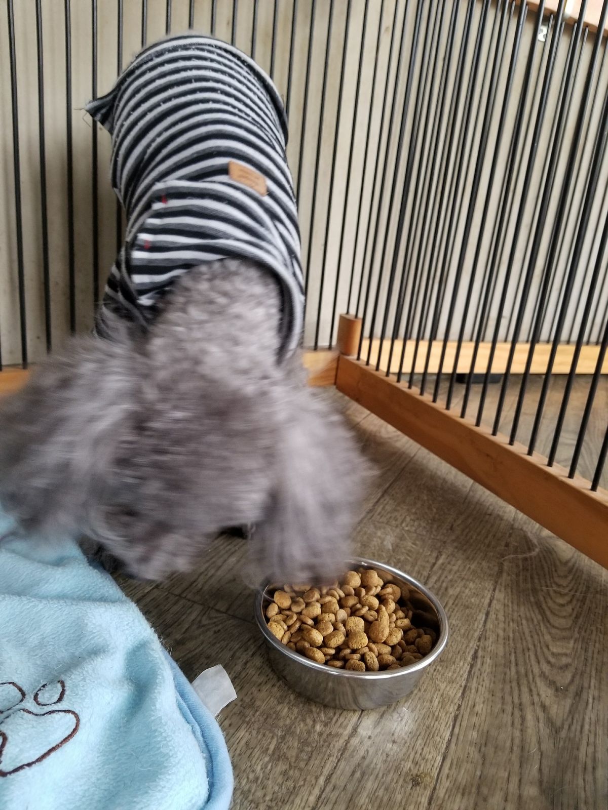 今日もすぐにおしっこをしました。 ご飯は口をつけず、鼻先で押して隠そうとしています。そのまま置いておきます。