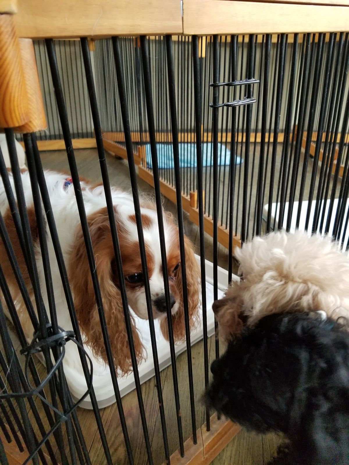 サークル越しに匂いを嗅ぎあっていたので扉を開けるとすぐに出てきました。