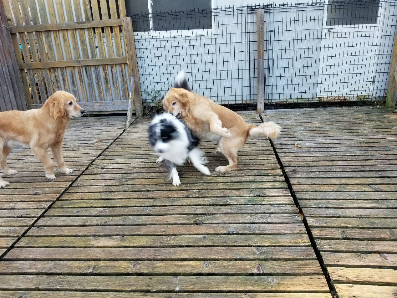 ラテくんは中型犬エリアでミックスちびちゃんに好き好きしています♪ レンくんは大型犬エリアでゴールデン小太郎くんやジョジョくんとダイナミックに遊んでいます♪