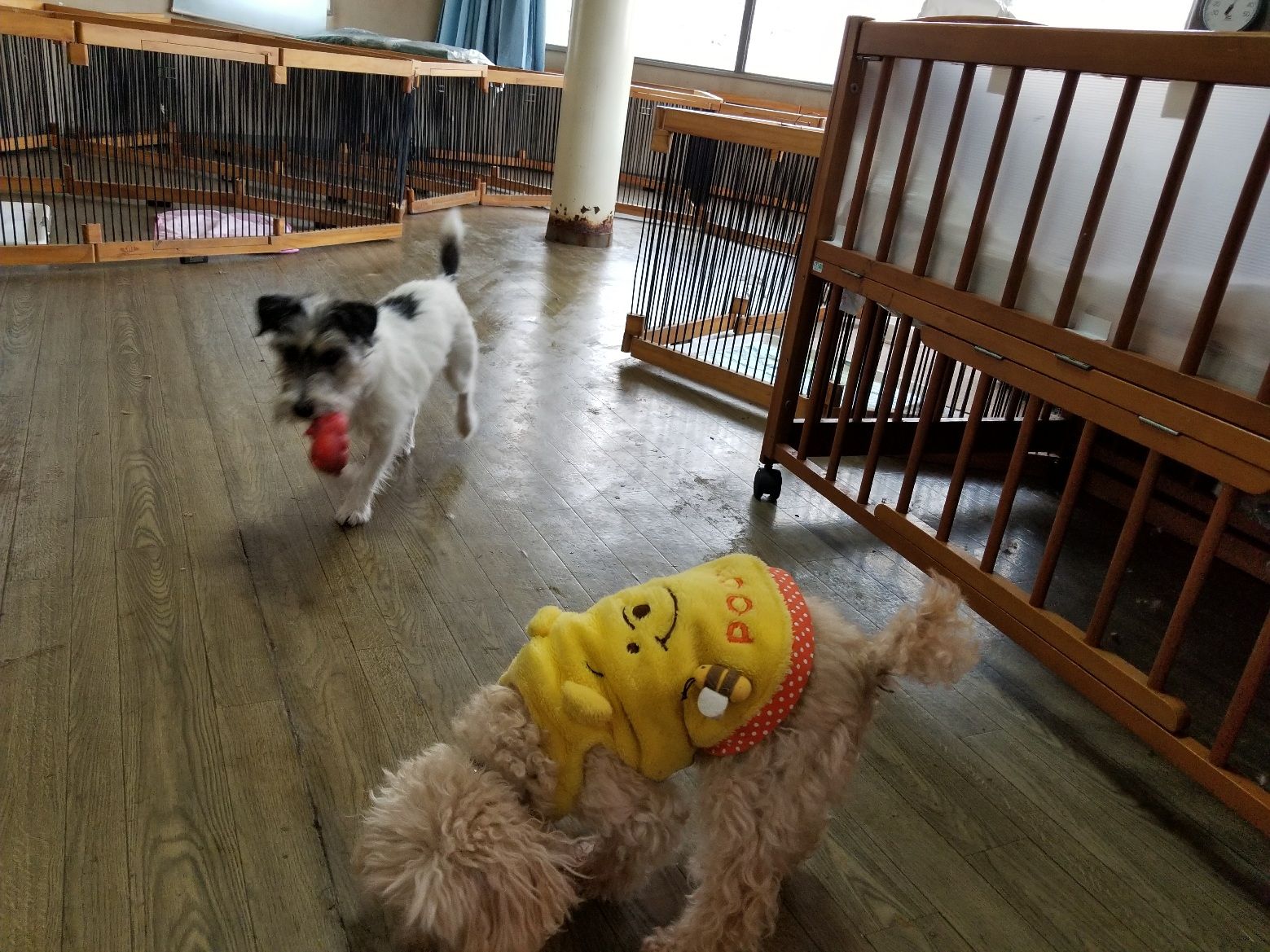 いつものようにおもちゃやボールを見付けると咥えて持ってきて遊ぼう遊ぼうしています♪ 他のわんちゃんと一緒にボールやおもちゃで遊んでいます。