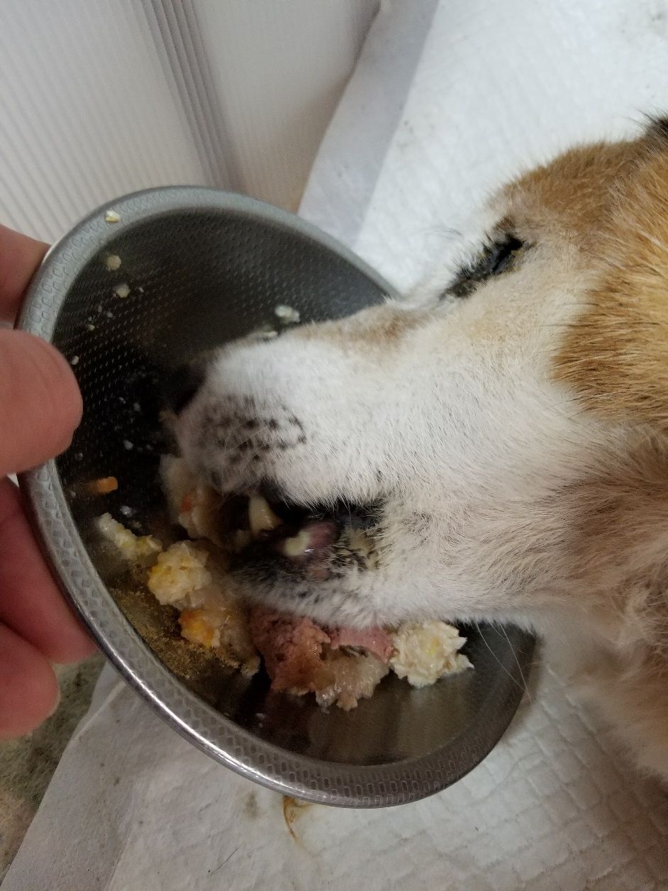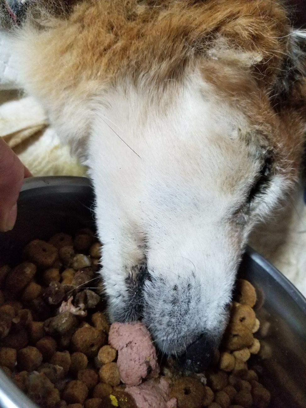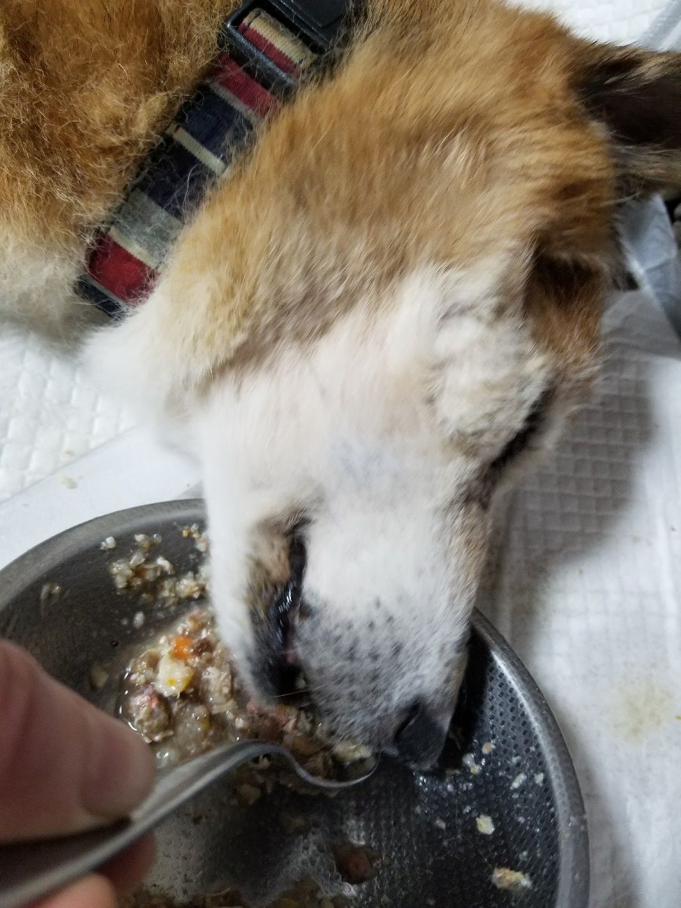 生涯お預かりミックスケンくん夕方はレトルトと缶詰めと馬肉をあげました。 舌ですくう力も弱くなっているようでスプーンで口元に持っていくと食べてくれます。 ほぼ完食しました。