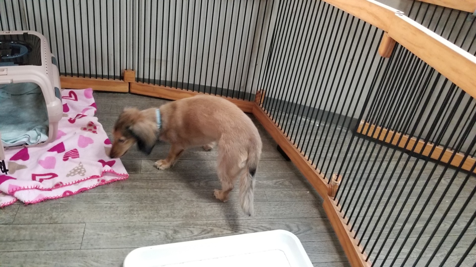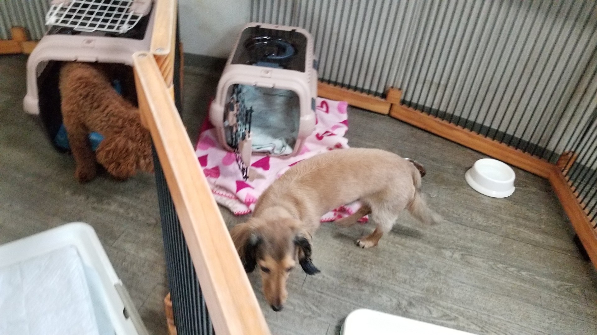すぐにバッグに籠ってしまうかと思いましたが、サークル内の匂いを嗅いで歩き回ったり、サークル越しに他のわんちゃんと匂いを嗅ぎあったりしています。