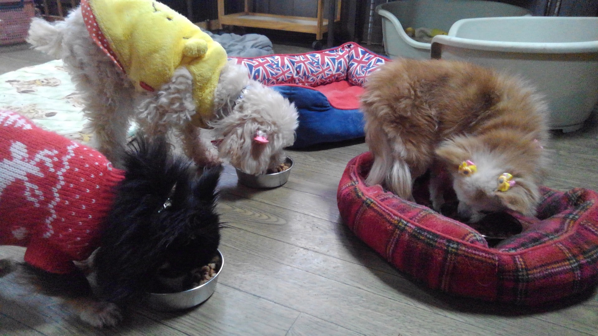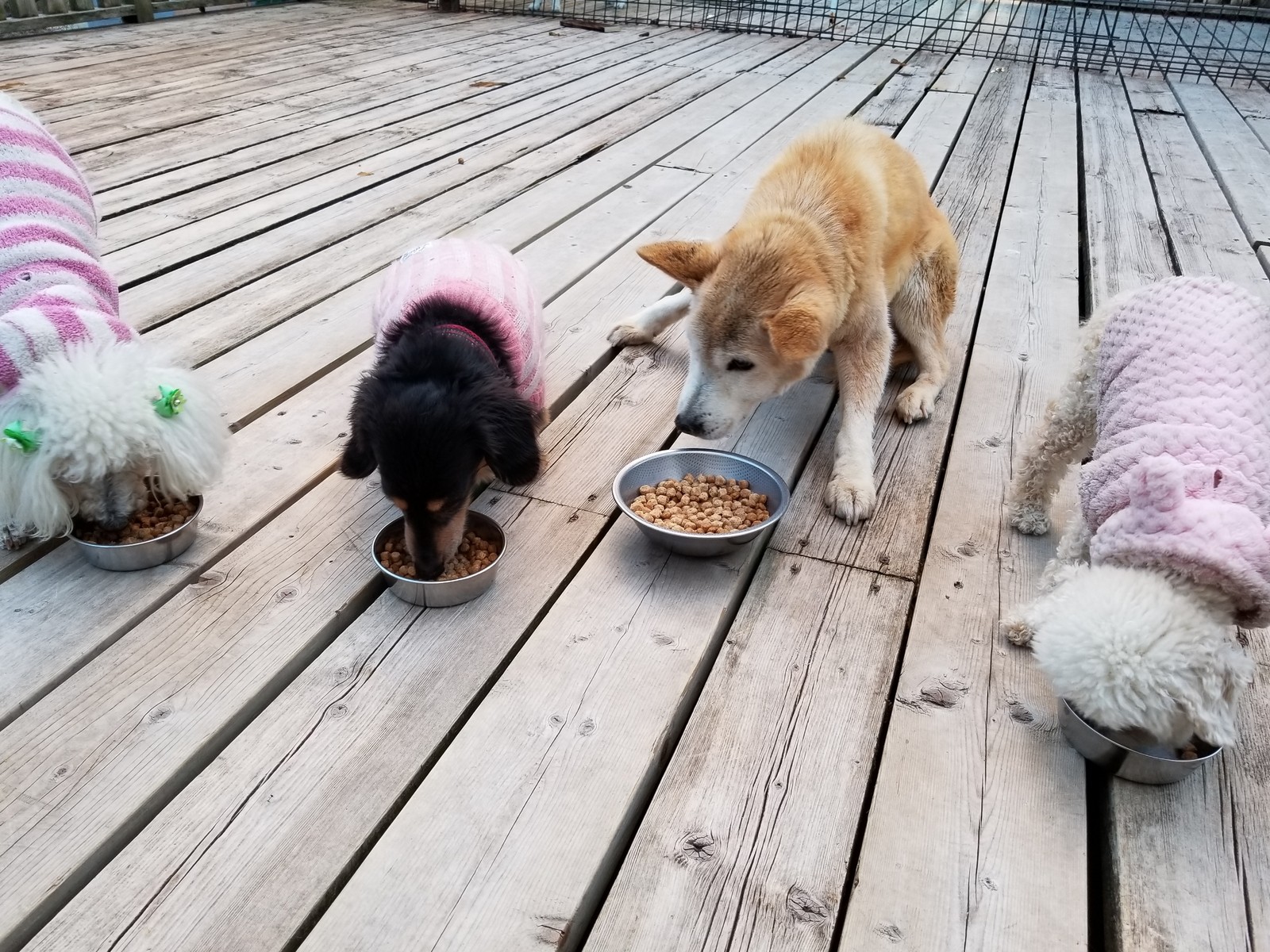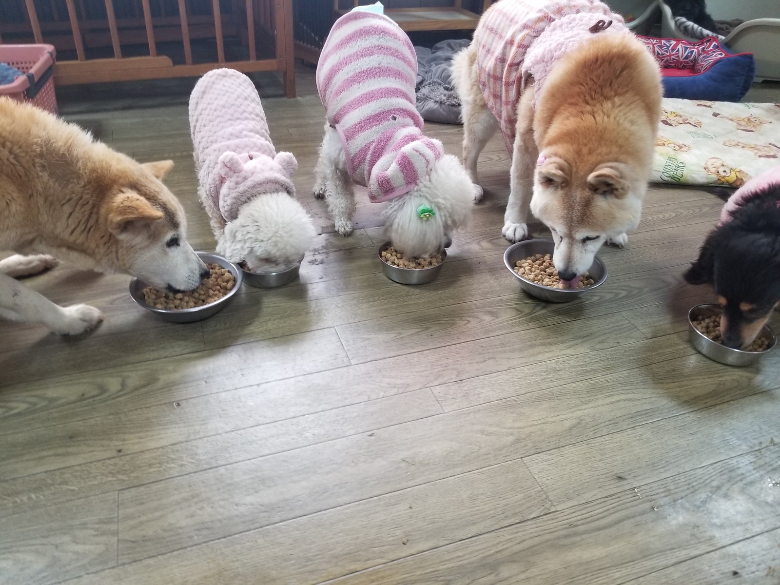 生涯預かり柴凛ちゃんと北海道犬リボンちゃん、トイプーベラちゃんとパピヨンパピー君しっかり完食しました。