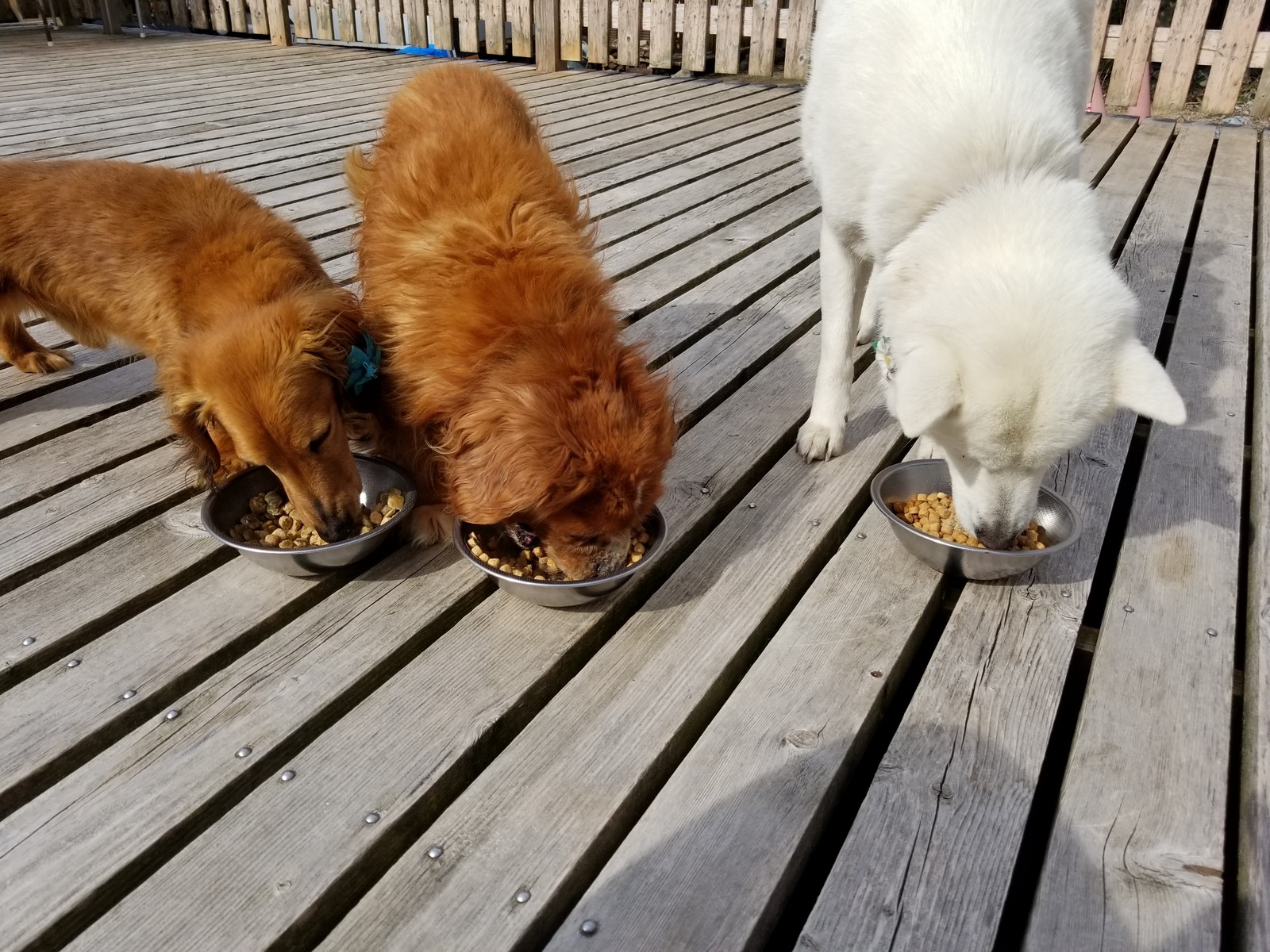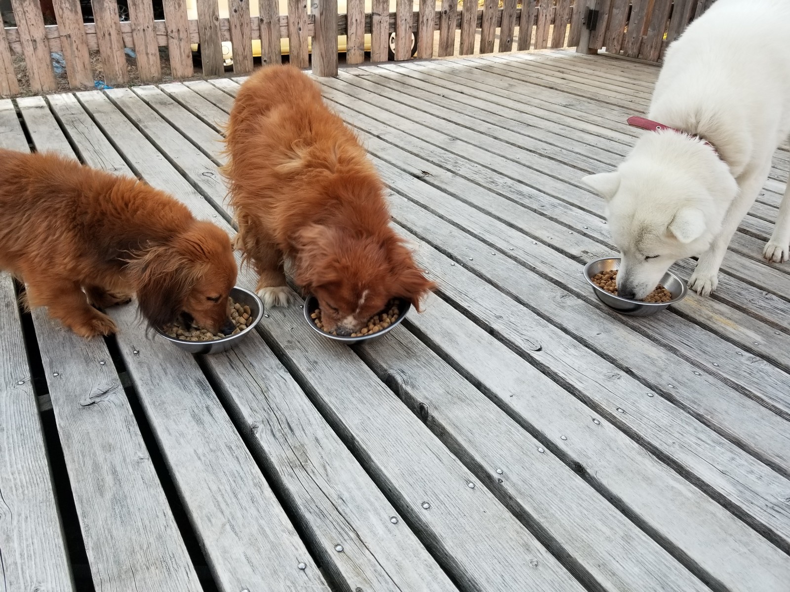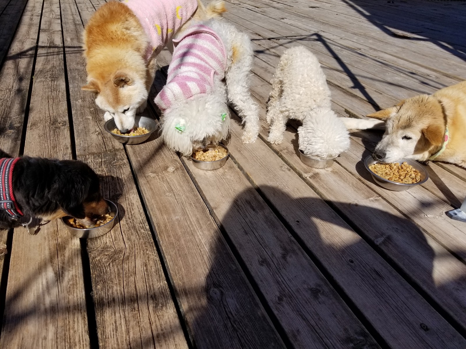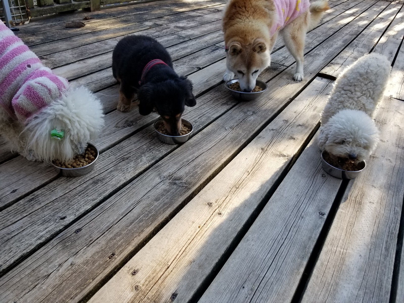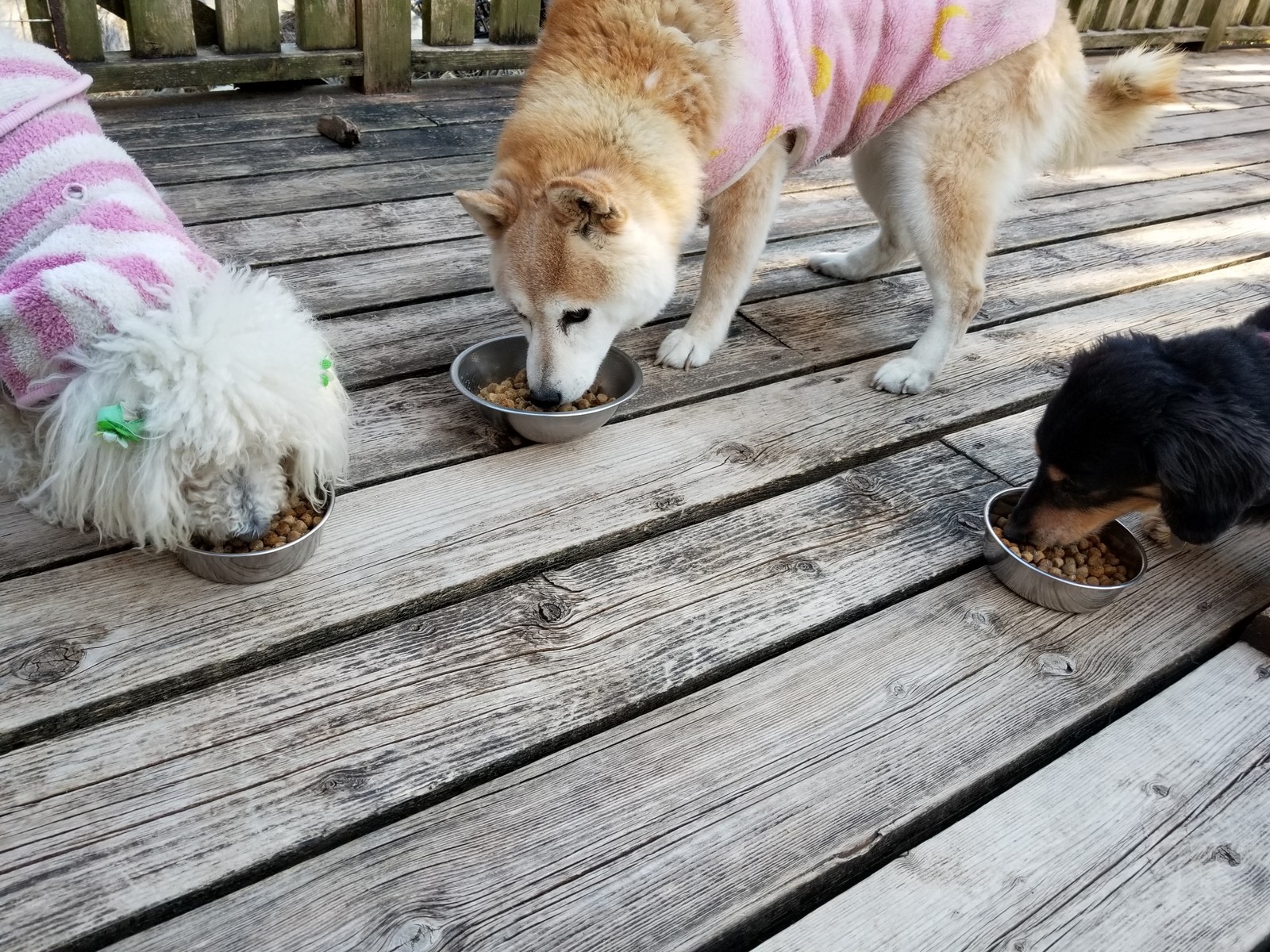 生涯預かり柴凛ちゃんと北海道犬リボンちゃん、ミックスのんちゃんとチビちゃん、しっかり完食しました。