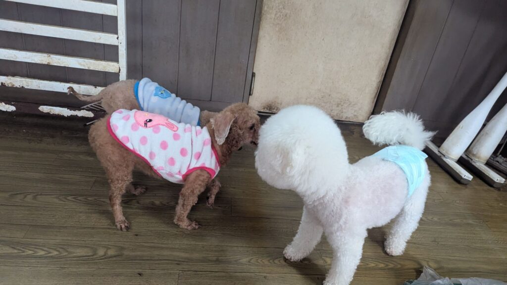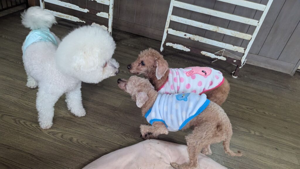 ミックスココちゃん、マルプーらんまるくん、トイプーララくんはトリミングに行っています。