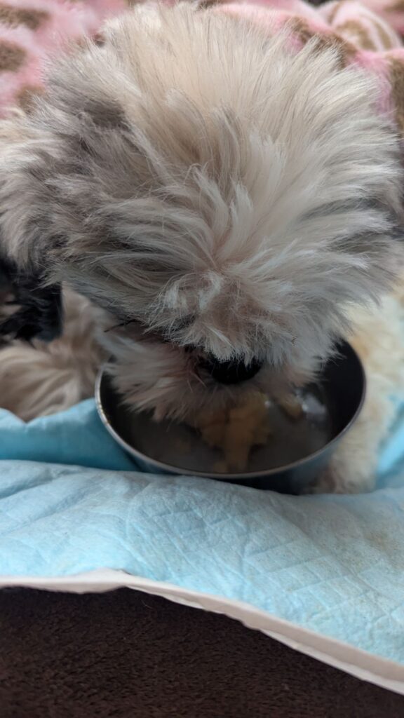生涯お預かりシーズーリコちゃんちゅーるをゆっくりと食べています。