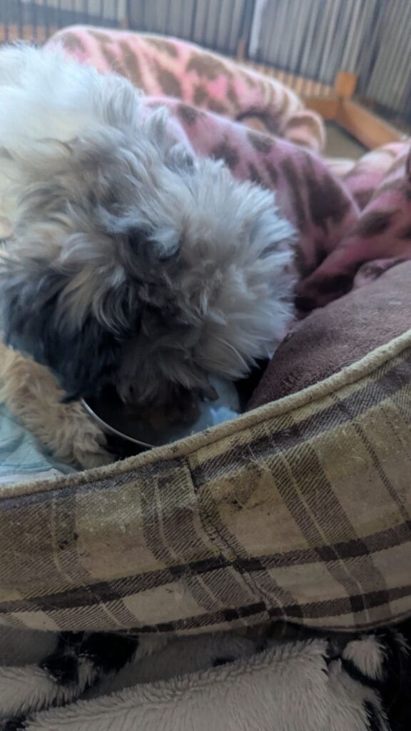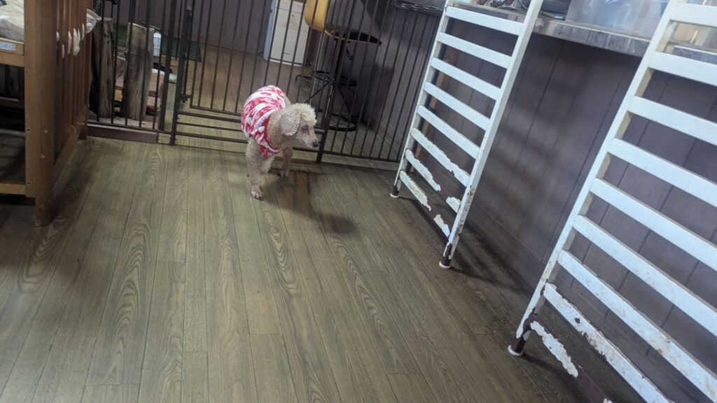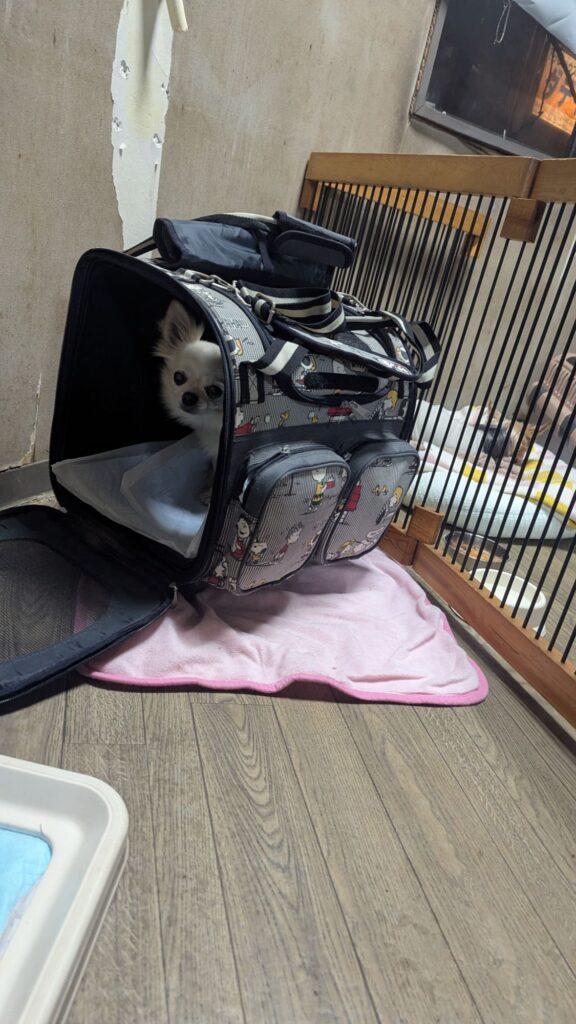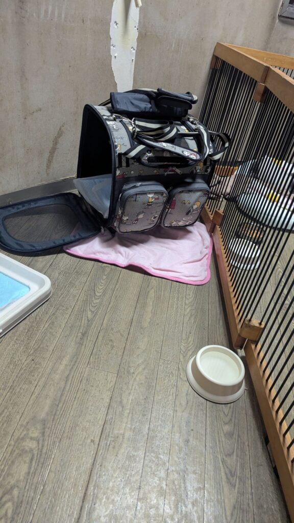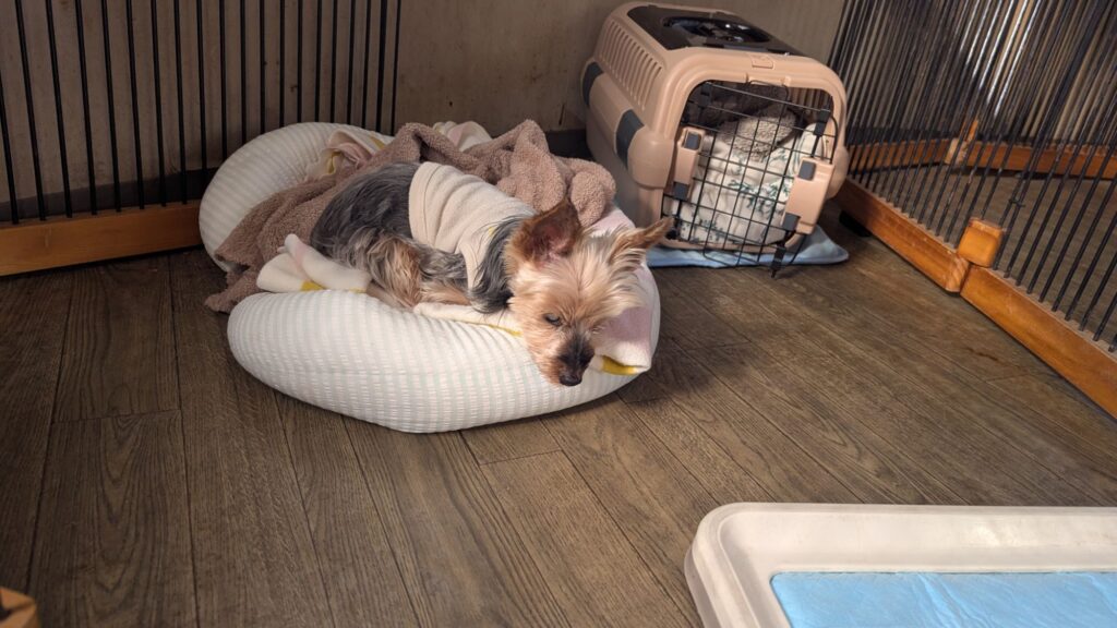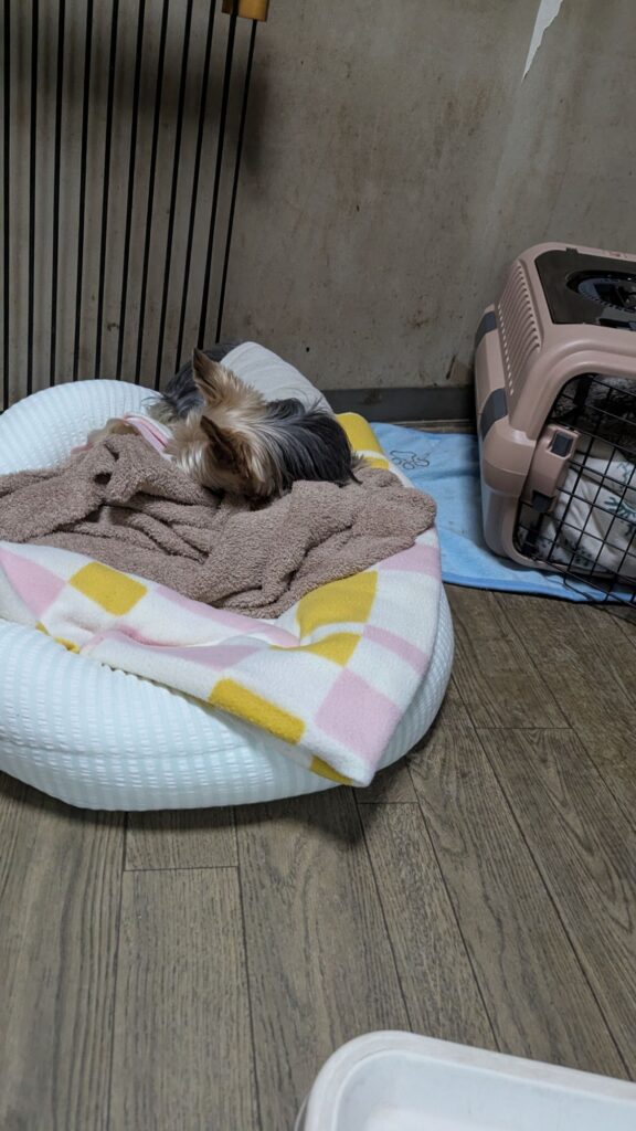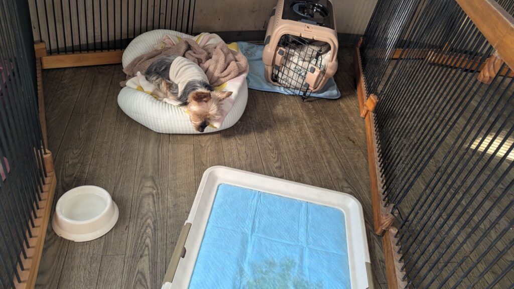 眠たいと思うと飼い主さんが言っていた通りでサークル内を少し歩き回ったらベッドで落ち着いたのでそのままサークルにいてもらいます。