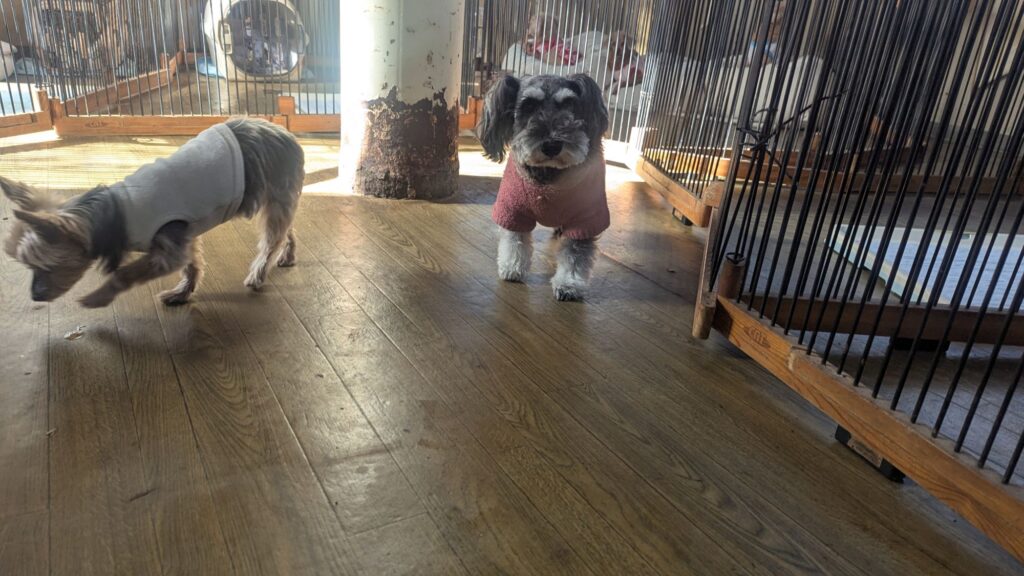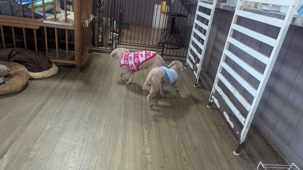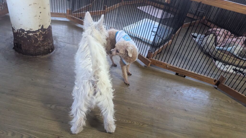 少し後追いはありましたが、他のわんちゃんと挨拶する子、匂いを嗅ぎながら歩き回ってる子とそれぞれの過ごし方でいます。