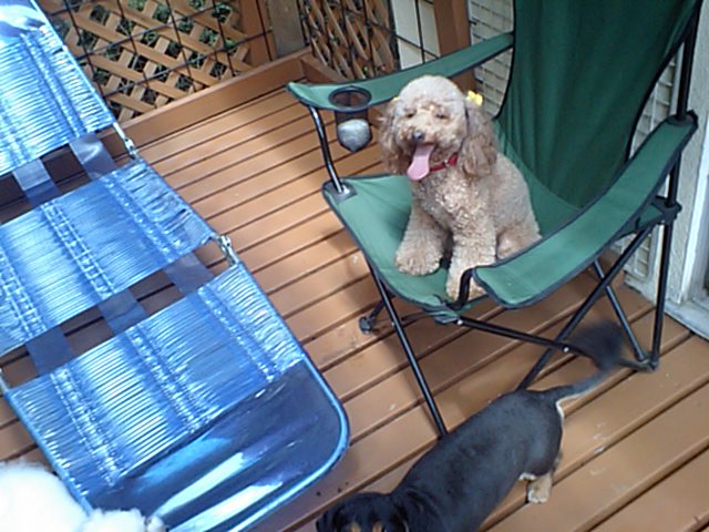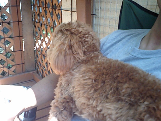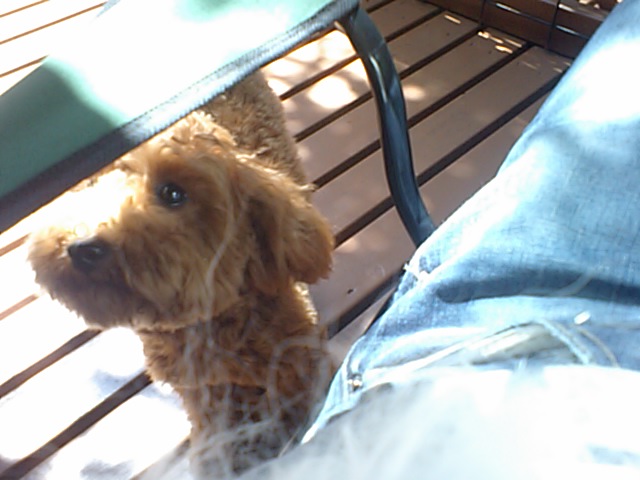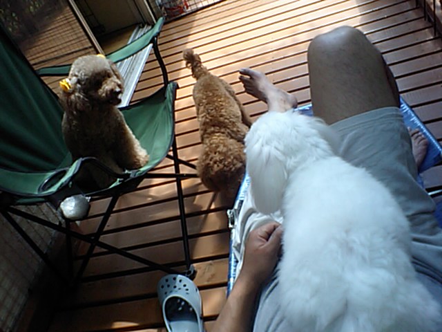 トイプーパピーちゃんまでが膝の上に… しかしすぐに落とされて不満そうなパピーちゃん。