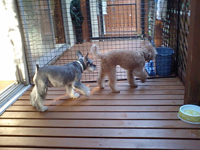 そしてまた興奮する繰り返しのトイプー君。サークルから出たら、シュナウザーちゃんが友達になりたがってます。