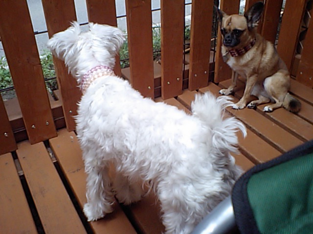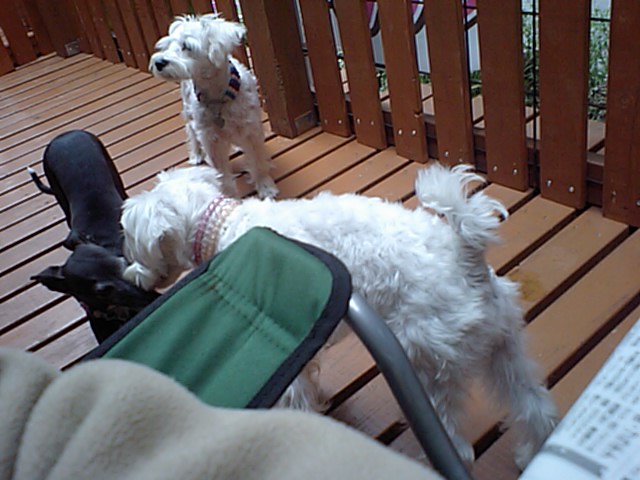 店長はコーヒーを飲みながら新聞を読みたいのですが、ワンコ達は店長の膝の上を狙ってます。