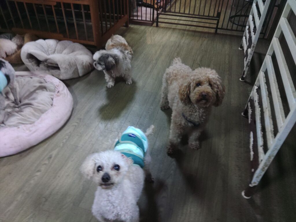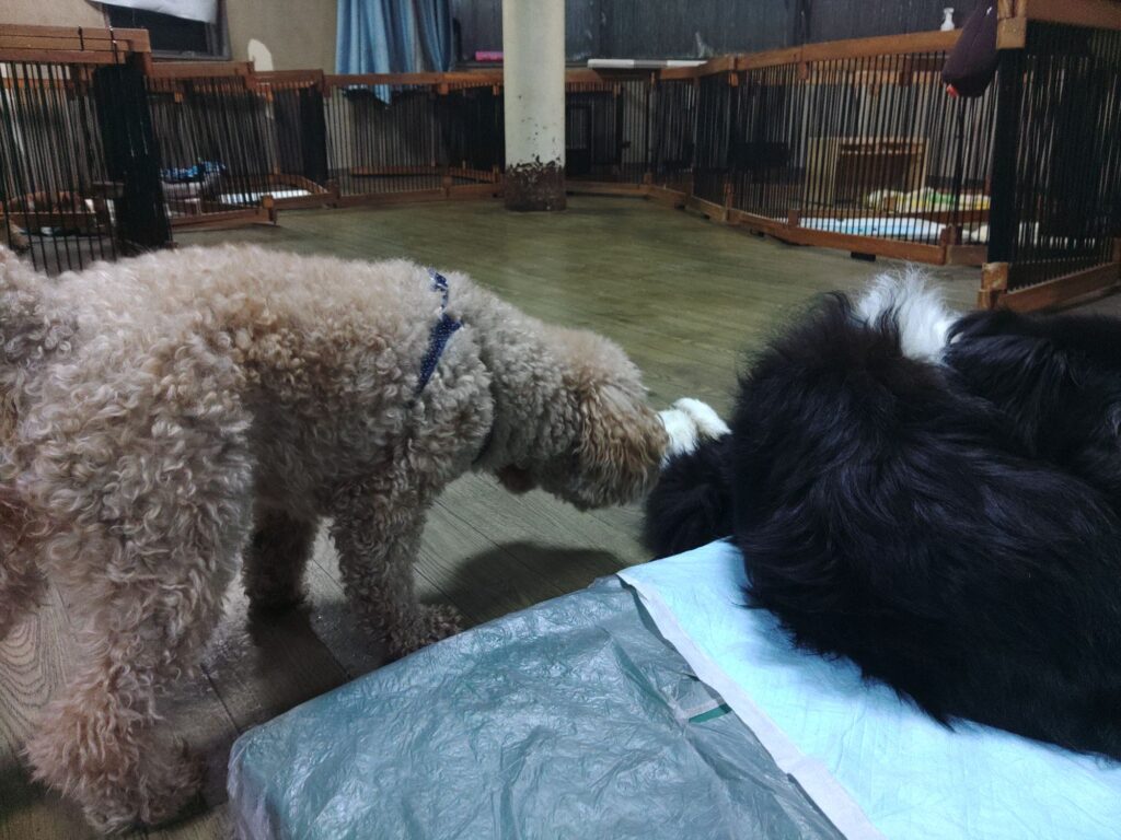 常連さんのトイプーロクくんとコーギーハチくんがチェックインしました。匂いを嗅いで嗅がれてガチャガチャと駆け回っています。