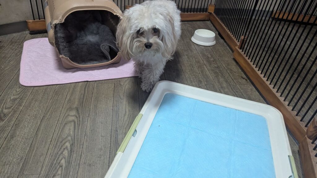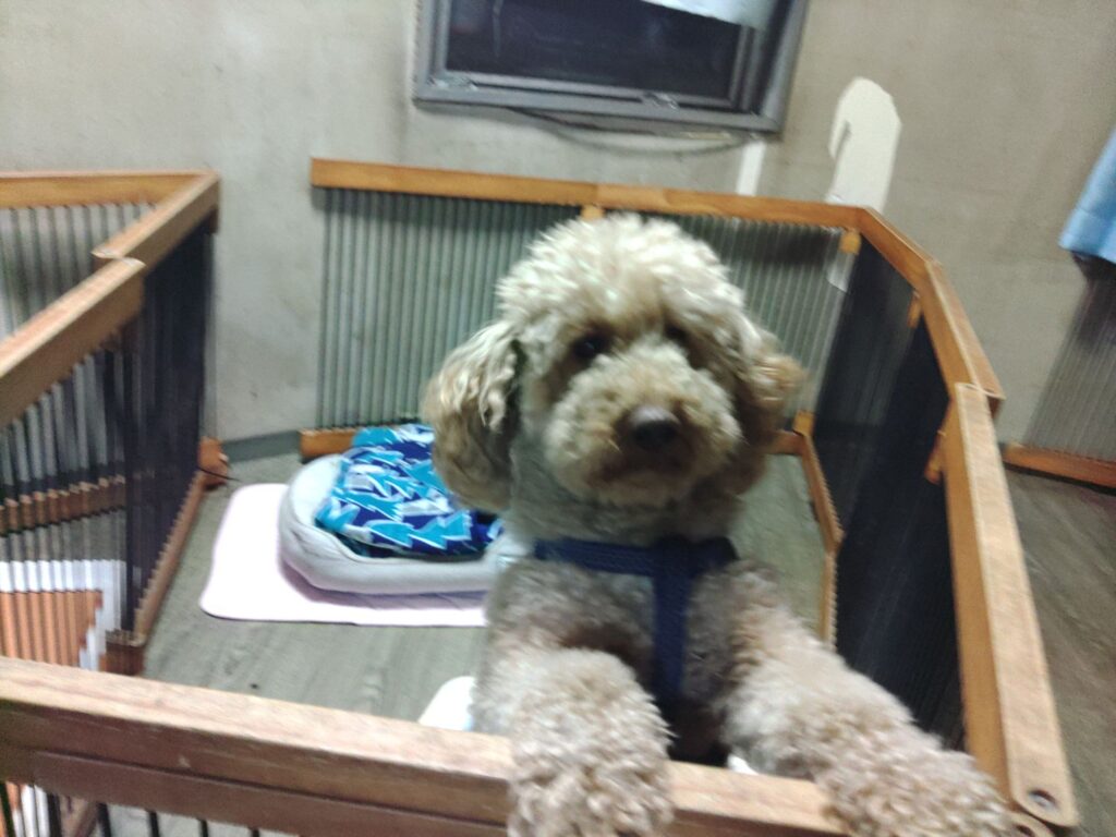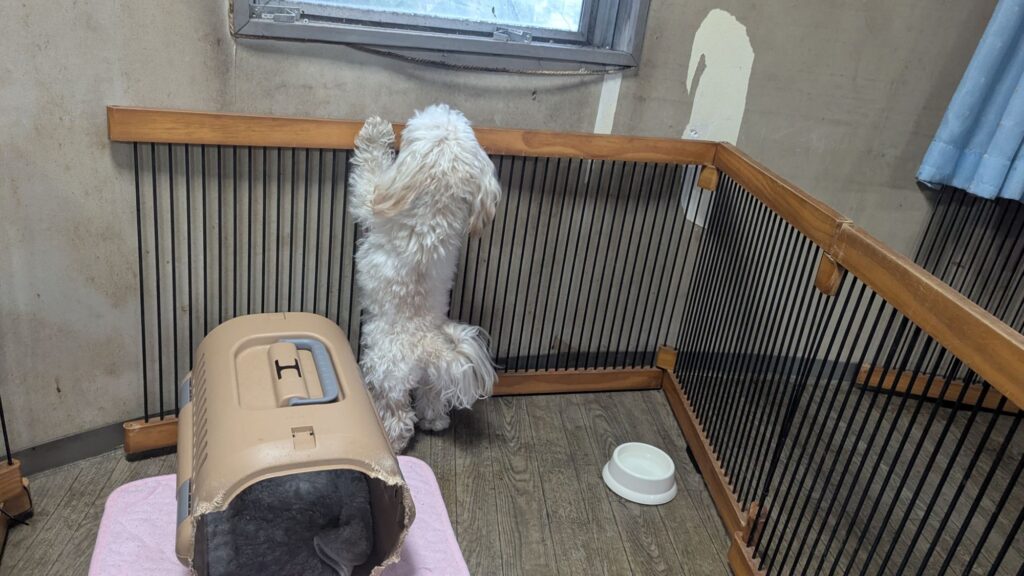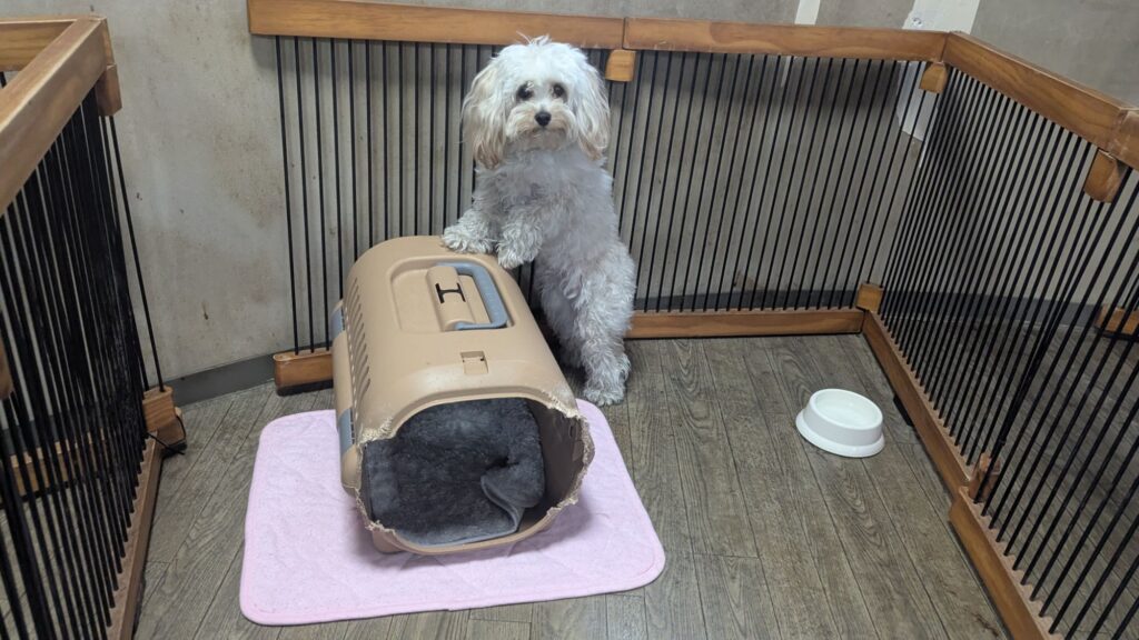ビショチワリリーちゃんがチェックインしました。わんちゃんには緊張しちゃうとのことなのでサークルで様子を見ています。サークル越しには挨拶しているので時間が経ったら大丈夫かな?