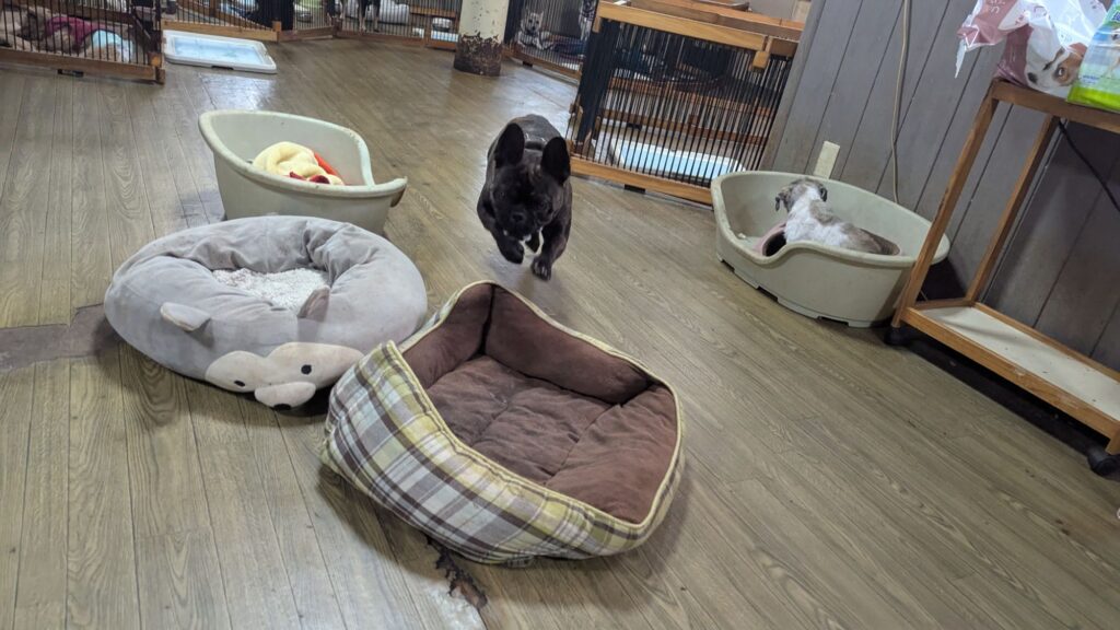 常連さんのフレブルゴンくんがチェックインしました。いつもはデッキに出ますが、今日は雨降りなので中で過ごしています。駆け回ってみんなに挨拶してまわっています。