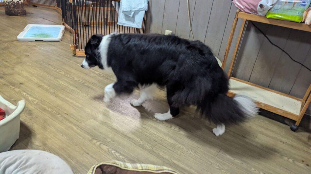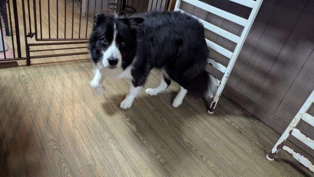 常連さんのボーダーコリーロッキーくんがチェックインしました。デッキに出たそうなロッキーくんですが、雨降りなので出られませんね。店内で少し運動したらサークルに入ろうね。